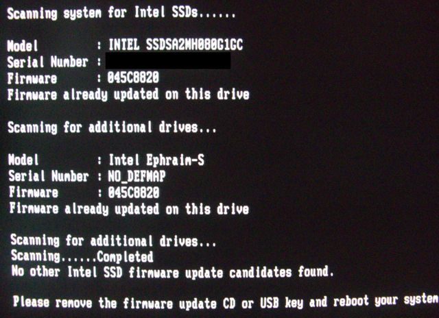 さて、突然変異で4.2PB化してしまったX25-Mですが、現在購入したSofmapに「ファーム更新失敗しちゃったんですが、どうしたもんでしょうかね?」的な問い合わせをしている最中です。んで、待ってる間ヒマなのでちょっと検証でも。現在Intelのサイトで公開されている最新のファームはIntel® SATA SSD ファームウェア・アップデート・ツール Ver.1.2 080902G98820.isoですが、今回使用したのはVer.1.1の04098820.isoです。何でかといいますと、Ver.1.2の080902G98820.isoを使うと「IntelのSSDはないよ」といわれファームの更新ができなかったためです。Ver.1.2は新型34nm用のものなのかな?とか勝手に決め付けてVer.1.1.の04098820.isoを使ったらめでたく認識。8820にアップされることには変わりないからこっちでいいやということで実行→オワタ\(^o^)/となったわけです。で、まあ、なんかの勘違いだったのかな?ということで再度アップデートツールを起動し認識してるかどうか確認してみました。Core i7+X58(ICH10R)という構成にIntel純正のX25-M(旧型50nm)とPQIのX25-M(更新失敗したやつ)がぶら下がってるマシンでアップデータツールを実行してみます。んで、IDEモードで起動。まず、Ver.1.1(04098820.iso)を実行した場合(クリックで少し拡大)INTEL SSDSA2MH080G1GC(Intel純正)とIntel Ephraim-s(ファーム更新失敗したPQI製)の両方が認識されています。どちらも(名目上は)8820にアップされているので更新自体はできません。んで、Ver.1.2(08092G98820.iso)を実行した場合(クリックで微妙に拡大)Intel純正のほうしか認識されません。PQIのほうは、おそらくですが正常に動いてたときから認識されてなかった(・・・と思う)中身は全く同じと思ってましたが、なんか違かったのでしょうか?まあ、いずれにせよいまさら何やっても元に戻るわけでもなく後のカーニバルなわけですが。とりあえずはSofmapの連絡マチ