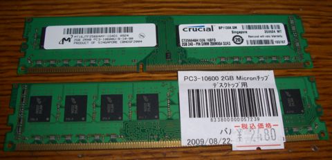 さて、メモリ値上げの予感ということでコレは仕入れとかないけないということで秋葉原を散策。 散々右往左往した挙句に買ったのがMicron DDR3 1333 2GB中古で1枚2,480円。画像には2枚しか写ってませんが4枚買いました。いっつも思うんですがねこの値札の貼り方はどんなもんなんですかね?まあ、どこの店だか分かる人にはすぐ分かってしまうと思いますが・・・Micronのメモリなんて久しぶりに買いました。DDRの頃はCrucial-Micronといえば良メモリの代名詞みたいなところがあってわざわざ海外から買ってる人もいましたね。まあ、DDR後期にはいろいろゴタゴタもありましたが・・・DDR3になった今はどうなんでしょうかね?さっぱり分からんです。