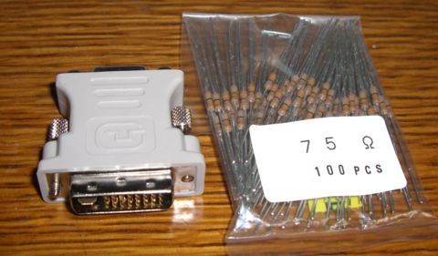 さて、BOINCをやってたりすると1台のマシンに複数枚ビデオカードをさすなんてことがあったりします。んで、基本的にビデオカードってケーブルをさしてモニタと接続しないと働いてくれない、というかCCCやGPU-Zで認識してくれないんですね。当然BOINCの各プロジェクトも全く解析してくれません。RADEONだけなのか、Geforceもそうなのかは知りませんが。まあ、Crossfireにでもすれば2枚カードがあっても接続するケーブルは1本でもいいのですが、そうでないなら片方はDVIで接続、もう片方はHDMIで接続、と1台のモニタに2本のケーブルで接続というなんとも無駄なことをしたりする羽目になります。んで、そんなとき使うのがこんな物(他サイトへ飛びます)というわけでこのダミープラグのような物を私も実際作ってみました。用意する物DVI-D-sub変換アダプタ抵抗・・・まあ、100本もいらないんですが、100本で100円だったので。ちなみに今回は1/4W 75Ωの物を使いました。んで、抵抗を適当な長さに切断で、U字型にします。ただ単にコレをD-sub側の然るべき穴に3つ突っ込んで出来上がり。上記のサイトを参考にしてもらうと分かりやすいですが1-62-73-8に差し込みます。所要5分とかからない簡単な作業。んで、実際に取り付けるとこんな感じになりまして、Windows上では汎用非PnPモニタと認識されます。コレでめでたくモニタと接続せずともしっかり働いてくれます。まあ、他にもいろんな対処法があるのかもしれませんが、こんなやり方もアリ、くらいで。