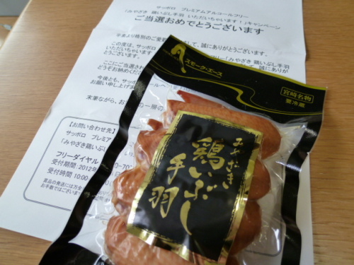 サッポロプレミアムアルコールフリーについているシールで応募した、鶏いぶし手羽が当たりました手羽の燻製みたいな感じでしょうか?まだ冷蔵庫の中で眠っています。 もともとプレミアムアルコールフリーも懸賞で当たったものだったのでタダでいろいろもらっちゃいました