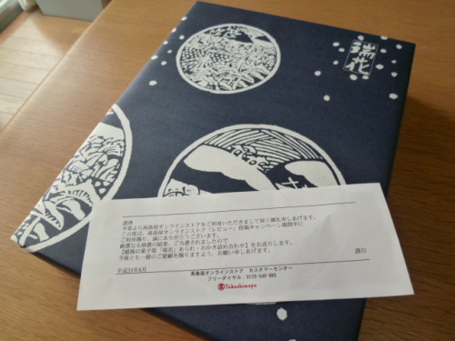 私、父の日や母の日など郵送でお菓子をプレゼントするときはだいたい高島屋オンラインで買っています。一番好きなデパートはもちろん高島屋です毎日行っても飽きないよ。 先日、オンラインで購入商品のレビューを書くと抽選で瑞花のおかきが当たるというキャンペーンがあったのでレビューを書いたら当選しました。当たったのはとてもうれしいのですが私、おかきやおせんべいってあんまり食べないのでこのまま近所に住んでいるお姑さんの一番上のお姉さんちに持って行きました。 中身は多分2100円のだと思います。だんなさんに『おばさん、私じゃなくって実の甥に会いたいだろうから、あなた持っていって』と言ったら、思いっきり断られたので私が持っていきました 楽しくおしゃべりしながら、だんなさんのことを『ほんとに家のことは何にもしないんですよ~。お義父さんとは大違い』(うちのお舅さん、何でも自分でやるんです。ホントに何でもやります。)『土日は毎週どこかに遠出しているんですよ~』『自分ばっかり、人生大満喫しているんですよ~』とほんとのことばっかり色々言ってきました。ちょっとすっきり 数日後、別件でたまたまお姑さんの2番目のお姉さんから電話がありました。そのおばさんにもだんなさんのことを『毎週のように東京に行ってるんですよ~。今日も東京も行っていて、ちょうど新幹線に乗っているころだと思います。でも理由は言うなって言われてるんです。自分だけ人生楽しんでいるんですよ~』いろいろ事実を言っておきました。 おばさんたち、できれば本人に直接注意してほしいのですが