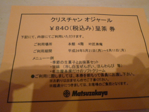 お母さんからこんなチケットをもらったので行ってきました。前は松坂屋にあるカフェならどこでも使えるようなチケットだったのですが今回からは叶匠寿庵限定になったんだそうです 840円分のものを食べることができます。 昼時に行ったらガラガラでした。 めったに食べないかき氷を注文しました。あんこと抹茶がすっごくおいしそうだったんです本来は白玉がついているのですが私、あんまり好きじゃないのでなしにしてもらいました。 表面は抹茶と練乳がたっぷりですっごくおいしいですが、1、2分で南極にいるかのような寒さに襲われました氷をすべて食べるのはなかなか苦しいので蜜が濃いところはいただいて、そうでもないところはのこしてしまいました。 一口サイズの『あも』もついています 大好きです。 おいしい氷でした。