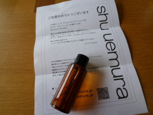 応募した記憶がないのですがシュウウエムラのクレンジングオイルのサンプルが届きました会員登録して、ホームページから応募したのかなぁ? 春頃、デパートのカウンターでサンプルがもらえるというキャンペーンをやっていて、そのときもらったものと全く同じものです。 デパートでもらって初めて使ったのですがすっごくよかったので今のがなくなったら、ちょっと高いけど買いたいなぁって思っていた商品 このサンプルは50ML入りなのですがこれでも1500円くらいします。すっごく得した気分もったいないので大切に使います。