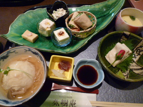 同期3人とランチに行ってきました。伏見にある『奏樹庵』というお店です。湯葉がメインで湯葉丼がおかわりできるということです。 ランチにしてはほんのちょっと高級な1480円のコースをお願いしました。 こんなかんじ。この日、混んでいたのか出てくるのがすっごく遅かったです。 変わった味の濃厚な冷奴。おいしいです。 これがおかわりできる湯葉丼。1杯おかわりしちゃいました 湯葉のお刺身と茶碗蒸し。 天ぷらはちょっと遅れて熱々がでてきました。 コースについているデザート。 こちらはクーポンでサービスのデザート。でも2つもいらないなぁ おいしいといえばおいしいのですが私、あんまりお餅とか湯葉とか好きじゃないのでもう一度来たいとは思えなかったです。1480円払うんならおいしいお肉かお魚がほしい天ぷらも海老だったらよかったのに・・・あとケーキもほしい