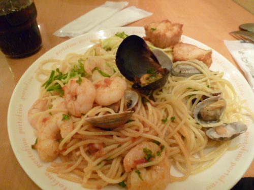 私、台湾人のお友達がいるんですね日本人の男性と結婚していて、日本に住んでいたのですが離婚して今は台湾に戻っています。子供に会うために今、日本に帰ってきているというのでランチにいってきました。名古屋駅前、センチュリー豊田ビルのポルトフィーノに行ってきました。ランチはパスタの食べ放題なんです。お値段は平日は980円、土日は1280円。 12時ちょっと前に行ったらすごくいろんな種類があってよかったです。ただ保温効果がなく、フライパンにのったままおいてあるので冷めるのも早く、ずーっと残っているパスタもけっこうあります。 からあげとかカレー、デザート、コーヒー、紅茶もあって時間制限もないのでゆっくりできます。食べ過ぎたので夕ごはん、サラダだけで大丈夫でした。 友達の話は台湾は同じアジアといえ、よくも悪くも考え方がいろいろ違うから、やっぱり国際結婚って大変だろうなぁと感じました。 こんなのを2皿も食べちゃいました