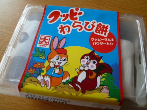 冷蔵庫を開けたら、こんなかわったものが入っていました。 クッピーわらび餅。私は絶対に買わないですがだんなさんなら買いそう吹田のサービスエリアで発見したそうです。地元の会社なのにこの辺りでは見たいことないなぁ。 わらび餅はブルーなのですが味は普通のわらび餅。きな粉ではなく、ラムネの粉がついてます。私はラムネがあんまり好きじゃないのでイマイチでしたがだんなさんはラムネが好きなのでけっこう気に入った様子 ここの会社の息子、うちのだんなさんと中学・高校と同級生だったそうです。あだ名はもちろん『クッピー』だったそうですよ