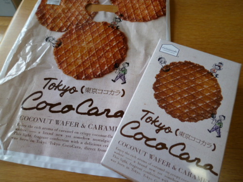 サンプル百貨店で当選していただきました東京ココカラというお菓子です。 右がお菓子の入った箱です。左のようなお菓子と同じ写真がプリントされた袋に入っていました。かわいいです 個包装もひとつひとつ柄が違って、これがまたとってもかわいいのです。お菓子はとっても薄いワッフルです。メープルシロップのすごくこうばしいにおいがしてたまりませんサクサクとおいしくて、何枚でも食べられちゃいます。羽田空港で購入できるそうです。お値段も525円とお値打ちなのでおみやげにぴったりですね。