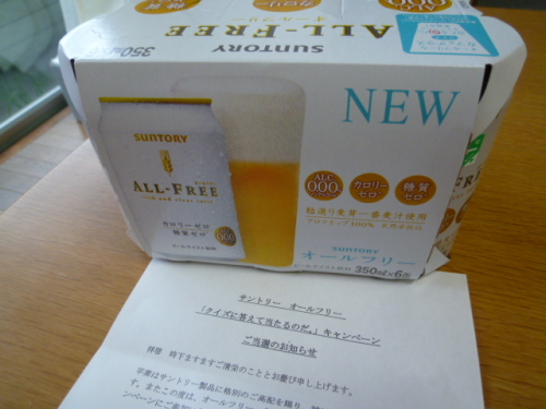 サントリーのオールフリー6本が当たりました。 サントリー、しょっちゅう応募しているのですが当たったのはたぶん初めてこの間、ネットでオールフリーを大人買いしたから当たったのかな?神様はみているのね たまに当たっていたアサヒの懸賞、最近は当たらないんです今までビールはアサヒやキリンを買っていたのですが最近、家で飲むのはオールフリーに変えたので買ってないんです。だから当たらないのかしら?? 久しぶりのビール(ノンアルだけど)の当選、うれしいです