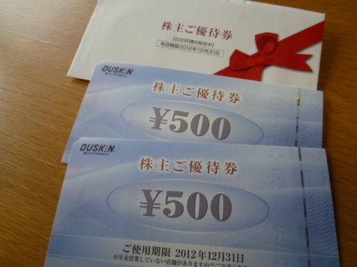 ダスキンの株主優待が届きました 1000円分の優待券です。ミスタードーナッツやモスバーガーで使えます。さっそくドーナッツを買いに行きたかったのですがうちにはお菓子がまだたくさんあるのでとりあえずやめました。なくなったら買いに行きます