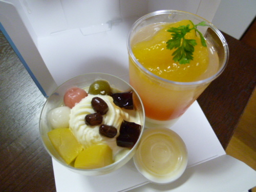 だんなさんが地下街で買ってきたデザート。 ベルヘラルドのゼリーと抹茶プリンどうみてもどちらも私の好みじゃないのですが一応自分がゼリーで私が抹茶プリンだそうです。前を通ったらどうしてもゼリーを食べたくなったんですって。プリンは私が少しだけ食べて、結局だんなさんが食べました。私の好みのスポンジケーキもあったんじゃないかと思うのですが どちらも300円くらいととてもお値打ちです。ここ、安いので今度からケーキを食べたいときはここにしようかな、不景気だし