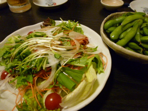 だ~いすきな世界の山ちゃんに会社のお友達と行ってきました3000円の飲み放題付きコースです。先日の同期の送別会のようなことにはならないといいのですが サラダと枝豆。 手羽先。一人5本。あっという間になくなりました。おいしい~ おさしみ。なかなかおいしかったです。 追加で注文した、私の大好きなカムジャタン。でも本場とは程遠く、イマイチでした 手羽煮。これ、なかなか好きなんです。 追加注文のみそうずらフライ。これは最高。 追加で頼んだ黒手羽先。これ、私大好きなんですが好き嫌いが分かれるみたいです。今回は気に入ってくれた子がけっこういました。 トッポギ。うずらが入っているのがうれしい 太巻き。これはいたって普通。 デザートのオレンジ。 飲み放題はどんどん持って来てくれるので10杯以上飲めました。しかもラストオーダーが20分くらい延長されていて、『2杯頼んでもいい?』と聞いたら『いいですよ~』と快諾してもらえました。店員さんもすっごくおもしろくって感じがよくて料理もおいしくて最高でした。いろいろ追加注文したけど、割引券もあったので一人3200円くらい。 やっぱり山ちゃん、大好き