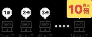 * 特典1 ショップ買いまわりでポイントアップ:1,000円(税込)以上の買い物をしたショップの数に応じて、ポイント倍率が上がります(最大10倍)。