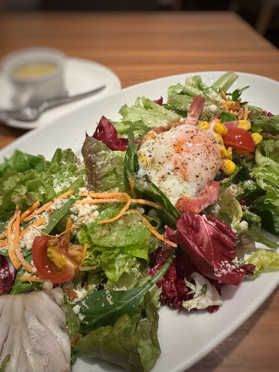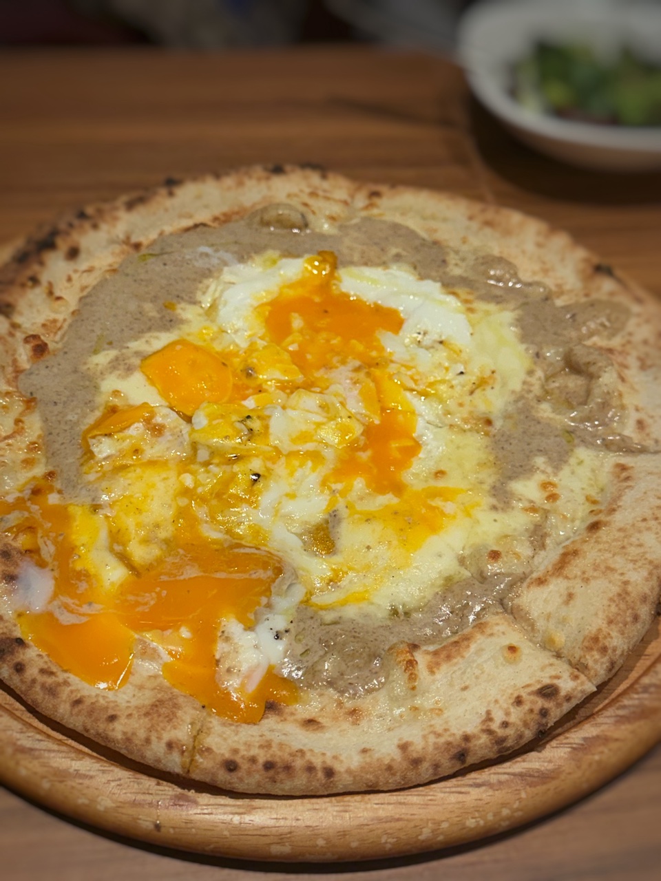 そういえばクーポン使ってなかった!!の第2弾 俺の泡グラスをグループ全員(4人までかな)にフリーでいただけちゃうんですもの…一人じゃ行きにくい?ので2人でいつもお伺いしているヤエチカのイタリアンこの日もお肉の「メインランチ」狙いで…ですが、あいにく牛すじメニュだったので方向返還(牛すじメニュはそこまで好きじゃなく…)ピッツァとサラダをシェアすることにサラダは俺んちの気まぐれサラダ…あら?だいぶん雰囲気がかわりましたねもちろん野菜もなんでも高騰の折り1078円と以前よりお値段変わらずですので、内容が変わるのは致し方ないのか…葉物盛り盛り、おんせんたまごがドンっ後はベーコン、クルトンのみでしたドレッシングは別添えにしていただいたのですがドレッシングも変更になっていて以前のイタリアンドレッシングからアンチョビのドレッシングになっていましたこのドレッシング、めちゃくちゃ美味シンプルな葉物ですが種類はかなり多く、量も多そこにアンチョビのきいたオリーブオイルベースのドレッシング、これはこれでありだなぁ特にカボチャサラダやレーズンが入っていたりしていた以前のものより潔くて好みかも…食べ終わるころに届けられたのはトリュフとポルチーニソース半熟卵のビスマルク ものすごく久しぶりにお目にかかりましたがこちらは記憶から変更なしの王道ビスマルク夜だとその場でカットしていただけるのだけれどランチだと初めからカットされている状態そのため卵が どろどろりんってなっちゃうけど、この日はどう考えてもたまごが多くない?たまご4個分くらいある気がする …サービス?さっきサラダにもたまご1個入っていたのでもしこれが4個なら… 摂取過多かもねトリュフソースとキノコペーストはとても良い香りとろとろのモッツァレラチーズと半熟たまごナイフでカットしても口元に持っていくのが至難の業って感じのトロトロさでもおいしくておいしくて…たまごがどんどんと固まっていく感じで黄身は最後には目玉焼きの固まったところ?みたいなになっておりました ←そこが好きなんだけど最近は巷でトリュフトリュフとトリュフだらけなので敢えてトリュフメニュは外しておりましたがやはりおいしいものはおいしい って実感本日もごちそうさまでした 泡もさんきゅ。Instagram はこちら(^^♪俺のイタリアン 東京駅ヤエチカ MAP東京都中央区八重洲2-1 八重洲地下街 B1F☆★ブログランキングに参加しています★☆一日一回ポチッと応援クリックよろしくお願いしますにほんブログ村こちらもよろしくねメッセージはこちらからお願いします