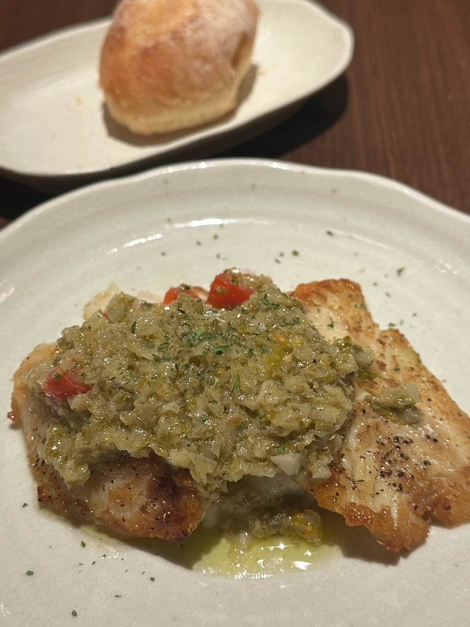 東京駅グランスタ八重北の1F八重北食堂にあるビストロ石川亭11時半くらいでなぜか入れるけれど何を食べてもおいしいお店なので貴重この日は… と外メニュを見るとメインのお魚料理が変わっていること発見!前菜とメインを選べるランチ1580円の前菜は変更なしで↓こんな感じ温かいピリ辛オニオンスープスペイン産ハモンセラーノのシーザーサラダレタスたっぷりグリーンサラダ 香味野菜のドレッシング冷製のカッペリーニ ツナとケッパーのトマトソース ベーコンとチーズのキッシュサラダ添えメインは定番かつ石川亭のスペシャリテざく切りキャベツ入り石川亭のハンバーグデミグラスソースチキンは鶏もも肉のロースト~ピリ辛トマトソースポークは豚ロースのグリル~ショウガのソースお魚はこのところブリのポワレだったのがやたっ!!!タラに変更になっているってことで入店QRコード読み込みでオーダーです前菜は温かいピリ辛オニオンスープオニオングラタンスープではないのであくまでオニオン入りのピリ辛スープ辛すぎず、オニオンの甘みを感じる冬にぴったりなスープ …ホッとするお味そしてメインはタラのポワレ~ラヴィゴットソース白いお皿に白いなめらかミルキーなマッシュドポテトそこに白い白身のお魚ので分かりにくいですが…こんがりと香ばしく焼かれた身厚のタラは2切れタラの上には刻み野菜とヴィネガーの酸味がきいたラヴィゴットソースがこんもりと盛られていますプチっとマイクロミニトマトも添えられていますタラの身はフォークで崩れるほどやわらかいのですがふっくらとしていて脂もありますそこにこのラヴィゴットソースですからマリネっぽくもあり …白ワイン欲しくなるお味こちらはフレンチビストロですがパンかライスを指定できるので …すが、もちろんパン温めなおしてあるパンはフワッとしているけれど中はモチっとしていて小麦の味がひろがります…前よりおいしくなっている?このパンでソースをお掃除しちゃうのはマストかしらね …お行儀悪くてすみませんInstagram はこちら(^^♪ビストロ石川亭 東京駅グランスタ八重北店 MAP東京都千代田区丸の内1-9-1 GRANSTA YAEKITA 1F 八重北食堂☆★ブログランキングに参加しています★☆一日一回ポチッと応援クリックよろしくお願いしますにほんブログ村こちらもよろしくねメッセージはこちらからお願いします