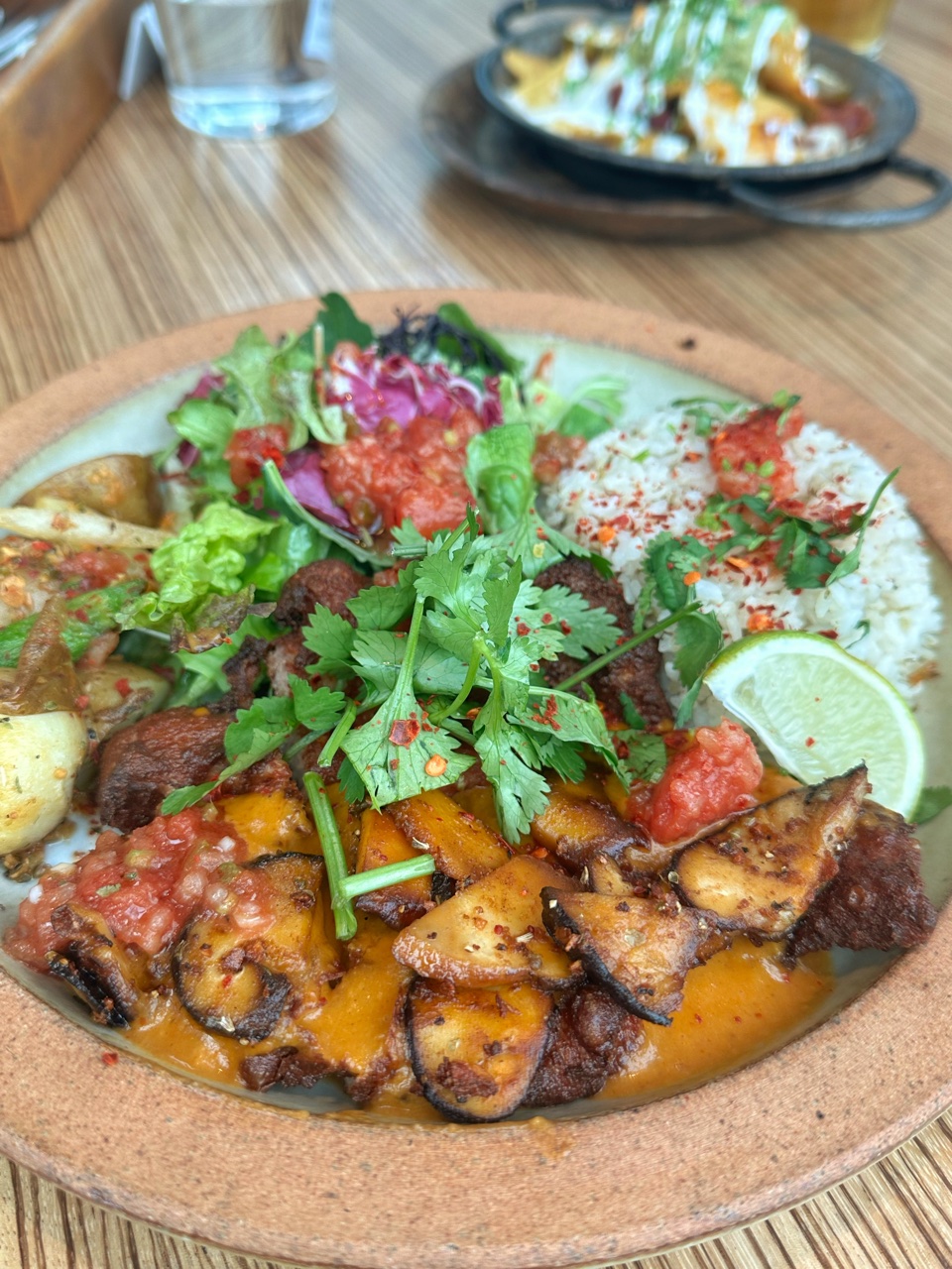 今週のWeekly Mexican Lunch!3月のテーマはVerduras y Salsaお野菜とソースを使ったお料理?…先月はシーフード&お野菜だったので似ている?3月1週目はChuletas con Salsa de Hongos y Chilesスペアリブのキノコ&唐辛子ソースって感じかしらインスタによると「徳島県の三浦さんの椎茸天恵菇(てんけいこ)を使ったお料理」だそうポークということなので、軽め?なクラシックナチョスのスモールサイズとシェアお久しぶりのナチョス自家製の揚げたてトルティーヤにキドニービーン、ペーストのフリホレスサルサ、ハラペーニョ、アボカドをのせてチーズをたっぷり、サワークリームも一回し熱々のスキレットで届けられるのでチーズがトロトロ~ おいしいのよね週替わりのプレートには「豚カツ」とインスタ情報でしたがあばら肉(スペアリブ)の揚げ焼きのようなポークその上にチポトレ(メキシコの唐辛子)やポルチーニ(これは感じなかったけれど)肉厚しいたけの天恵菇をふんだんに使ったクリーミーかつ濃厚ソースをたっぷりかけてありますさらに上に天恵菇のソテーをトッピングしてあるので椎茸しいたけな椎茸ソース 天恵菇は初めていただきましたが薄くスライスしてもなおその香りと味わいが辛みはあまりないクリーミーなソースにしっかりと残る贅沢なキノコですカリっとしたスペアリブに絡む絡む~サイドにはジャガイモとアスパラのグリル野菜サルサのかかるグリーンサラダそしてパラパラ感と香りが特徴のオレガノライス見た目も華やかなゴージャスワンプレートホクホクのポテトもシャキシャキのグリーンアスパラガスも侮れないおいしさお肉だけではなく野菜もお米もすべておいしい週替わりのワンプレート、来週はどんなでしょう楽しみでワクワクでございますInstagram はこちら(^^♪MUCHO MODERN MEXICANO(ムーチョ モダン メキシカーノ) MAP東京都千代田区丸の内2-7-3 東京ビルTOKIA 2F☆★ブログランキングに参加しています★☆一日一回ポチッと応援クリックよろしくお願いしますにほんブログ村こちらもよろしくねメッセージはこちらからお願いします