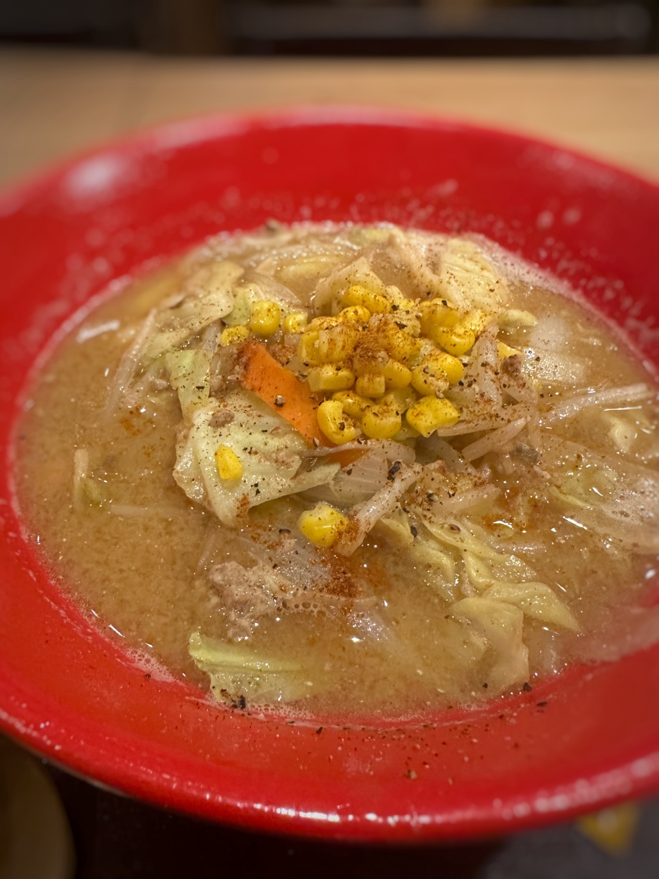 ランチでスープというのはなかなかハードルが高くてあの軽井沢のパンのお店のスープランチ…きっとこの時間はならんでいるしあそこのブイヤベースも良いな…行ってみよう!と伺ったらまさかの満席完全に路頭に迷ったかのような状態そして思ったのはラーメンの麺無しはどうだろう…北海道バルというだけあって?海鮮丼や豚丼がメインのお店ですが外のメニュに野菜たっぷり味噌ラーメンの文字…ということで、入店北海道味噌ラーメンは1100円このお店では最安値かしら?着丼ははやめでしたねが、メニュの写真とは全然違うかなぁ写真では野菜が盛り上がっていたのですがかなり地味目の盛り …野菜高騰のためかな?キャベツ、玉ねぎ、もやしとコーンガラムマサラ七味を振りかけいただきますスープを一口 …熱々の熱々 熱っそれだけでなんだか好印象なのも申し訳ないけれど実際最初の一口の印象って大切味は良く言えばあっさりとした味噌スープ悪く言うとあまり出汁やコクは感じないかな油分がほとんど感じられないのでどちらかというとお味噌汁な感じスープが飲みたかったのでこれはこれで良いけれどラーメンと認識されている方には物足りないかも麺は北海道小麦100%使用とのことで香りはよいですね …つるつるとしていてのど越しのよさそうな麺の量は多めですスープをガンガン吸ってしまうので本当はどこかに移したい気持ちでいっぱいですがさすがにそれは叶わず、麺1で野菜9くらいの割合でどんどん食べ進みます野菜は炒めずそのままスープに入れていあるのが残念ですが、玉ねぎとキャベツが大量なのが野菜スープ所望のワタクシにはうれしいですねチャーシューではなくそぼろのようなお肉がポロポロですので、タンメンの味噌味版って感じほんとうにあっさりしていたので胃にずしっとくることもなくおいしい野菜の味噌スープいただくことができましたInstagram はこちら(^^♪北海道バル 海 グランスタ八重洲店 MAP東京都千代田区丸の内1-9-1 グランスタ八重洲☆★ブログランキングに参加しています★☆一日一回ポチッと応援クリックよろしくお願いしますにほんブログ村こちらもよろしくねメッセージはこちらからお願いします