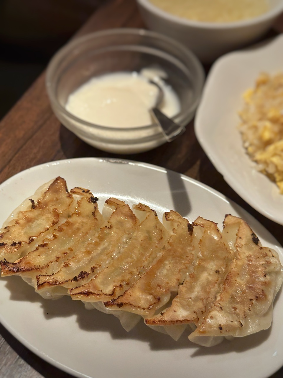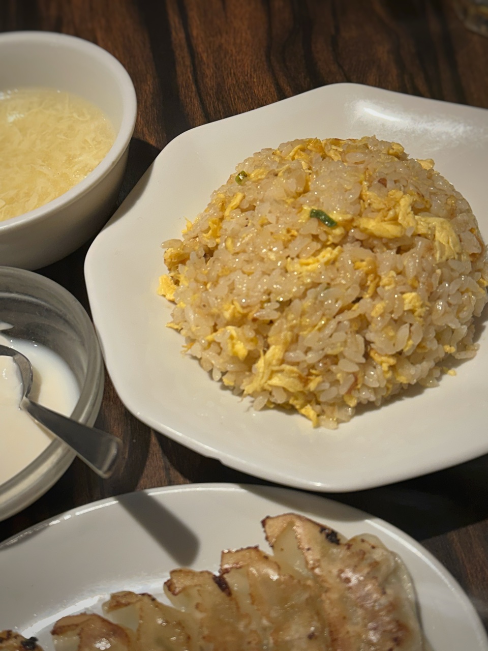 チャーハン、餃子、スープ、小杏仁豆腐付き