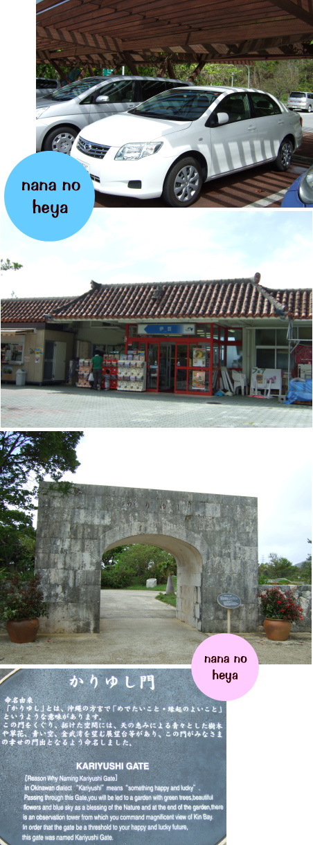 沖縄自動車道で北へ。沖縄道唯一のサービスエリア、伊芸サービスエリアで休憩です。写真、上は、今回4日間お世話になったレンタカー。レンタカーはトヨタで、最初はヴィッツ、パッソクラスだったのですが、無料でアクシオ、プリウスクラスにアップできました。プリウスだといいなーって思っていたのですが、残念・・・、アクシオでした。