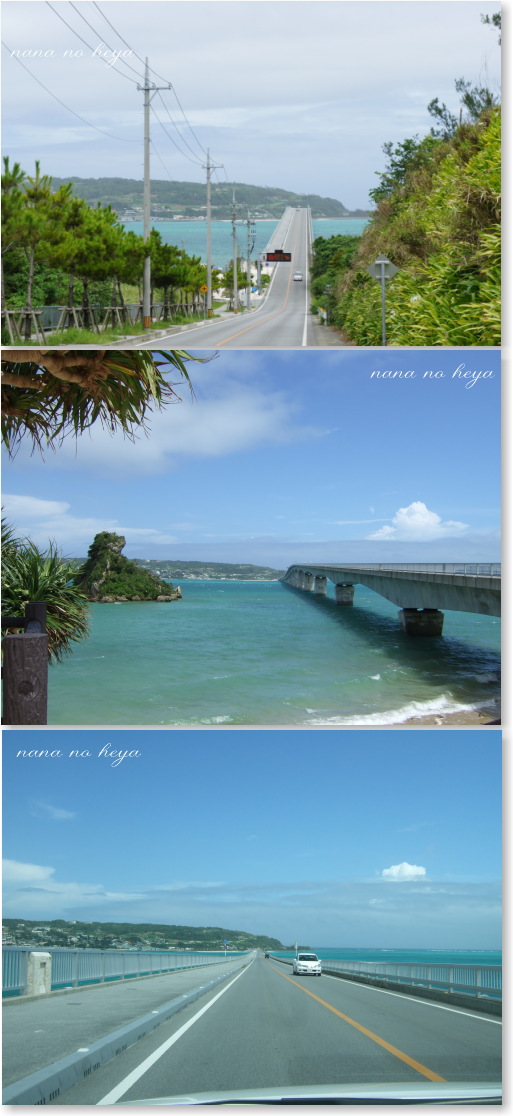 いつ台風が来てもおかしくない!と思っていたので、天気がいいうちに・・・と、まずは古宇利大橋へ。古宇利大橋は古宇利島と屋我地島を結ぶ全長1960mの橋です。海の上をまっすぐに伸びるこの橋は、両側に青い海が広がりとても爽快です。お天気が良かったので、ガイドブックの写真そのままの景色で、とても感動でした