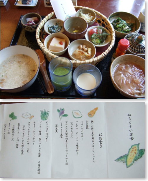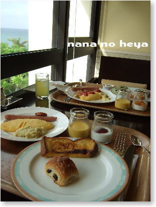 ホテル日航アリビラ2日目の朝食は、日本料理・沖縄料理の「佐和」でぬちぐすい(命薬)定食を食べました。ぬちぐすい定食は、長寿県沖縄に根付く沖縄料理の原点に戻って作る塩分控えめで、化学調味料や着色料、香料を一切使わない、こだわり定食だそうです。一日限定なのですが、私たちはギリギリ間に合いましたぬちぐすい定食の他に、デザートやお惣菜、ドリンク類はバイキングになっていて、この日も朝からお腹いっぱい食べました。