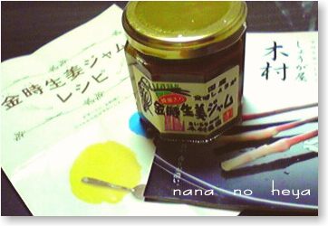 お友達から、しょうが屋木村さんの「金時生姜ジャム」をいただきました。先日、TV「知っとこ」でも取り上げられていたように、もちろんパンに塗ってもおいしくいただけるのですが、私は一緒にもらったレシピどおりにしょうが焼きを作ってみました。この蜂蜜入りの生姜ジャムに醤油とお酒を加えて豚肉にからませて焼くだけなので、とっても簡単なのですが、おいしくできましたよほんのり甘くて、お子様にもオススメだと思います。私は、寒くなると、このジャムをお湯で溶かして生姜湯を作って飲んだりもします