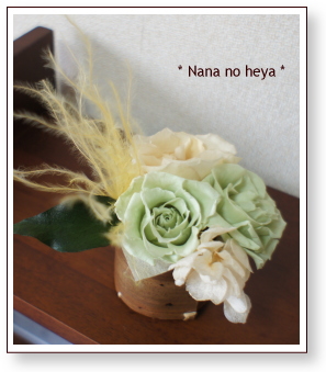 母の日に、プリザーブドフラワーのアレンジを作って贈ろうと思っているので、練習でミニアレンジを作ってみました。古くてちょっとよれっとしたバラをメリアにして大きくしました。メリアは・・・バラの花びらを一枚一枚取って、再び貼り付けるアレンジ。閉じたバラを広げた感じ(開花させた感じ)にするのです。↑説明が悪くてすみません(+_+)余談ですがソニーのコンパクト一眼カメラ、α(NEX-3)には、こんなおしゃれな写真が簡単に撮れる機能がついています