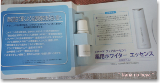 「ホワイターになろう」という持田香織さんのCMでもおなじみのメナード フェアルーセント 薬用ホワイターエッセンスのサンプルをいただきました。薬用美白美容液ですが、化粧水のようにさらっとした使用感。べとつかず、夏には使いやすいですね。安定化ビタミンC誘導体(APM)が、メラニンの生成を抑え、シミ・ソバカスを防ぐそうです。 2012年4月16日発売メナード フェアルーセント 薬用ホワイターエッセンス 100mL【新商品★メナードフェア企画30%OFF】