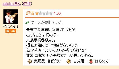 以下メール本文コピー------------------------------------------------------------------こんにちは。DIYツールドットコム お客さまサポートセンター 担当Kでございます。先日は当店をご利用いただき、誠にありがとうございました。本日ケース割れのために交換品と同時にお引取りいたしました商品が弊社へ到着いたしましたので、ご連絡させていただきました。このような明らかな割れがございましたのに、梱包時に気付くことがなく発送に至り、Iさまに多大なご迷惑をおかけいたしましたこと、本当に申し訳ございません…。より一層の注意を払いまして、このような事態を引き起こすことのないようスタッフ一同精進してまいります。今回ご購入いただきました商品についてのご質問や、万が一不具合の起きた場合などございましたら、お気軽にご連絡下さいませ。何卒よろしくお願い申し上げます。------------------------------------------------------------------溜飲は下がった。しかし、失われた時。は戻らない。どんなに安価な商品であってもそれを心待ちにしているかもしれない少数の人がいることを忘れてはいけないと思う。一杯のラーメン。
