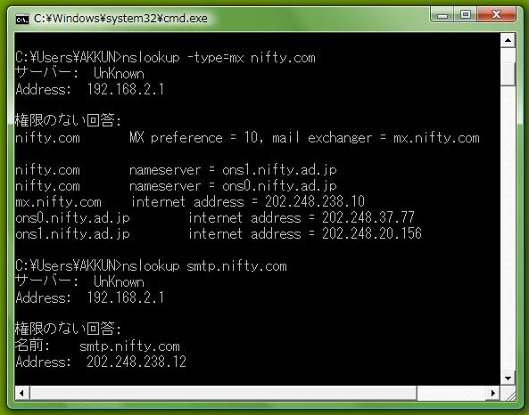 nslookup -type=mx nifty.com とかメールサーバのipアドレスを調べるhttp://ipnetwork.web.fc2.com/dns.html単にnslookup smtp.nifty.comの結果と4オクテット目が違うが、わしんとこは優先順位3番目かい!?