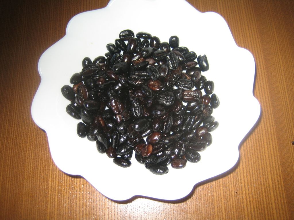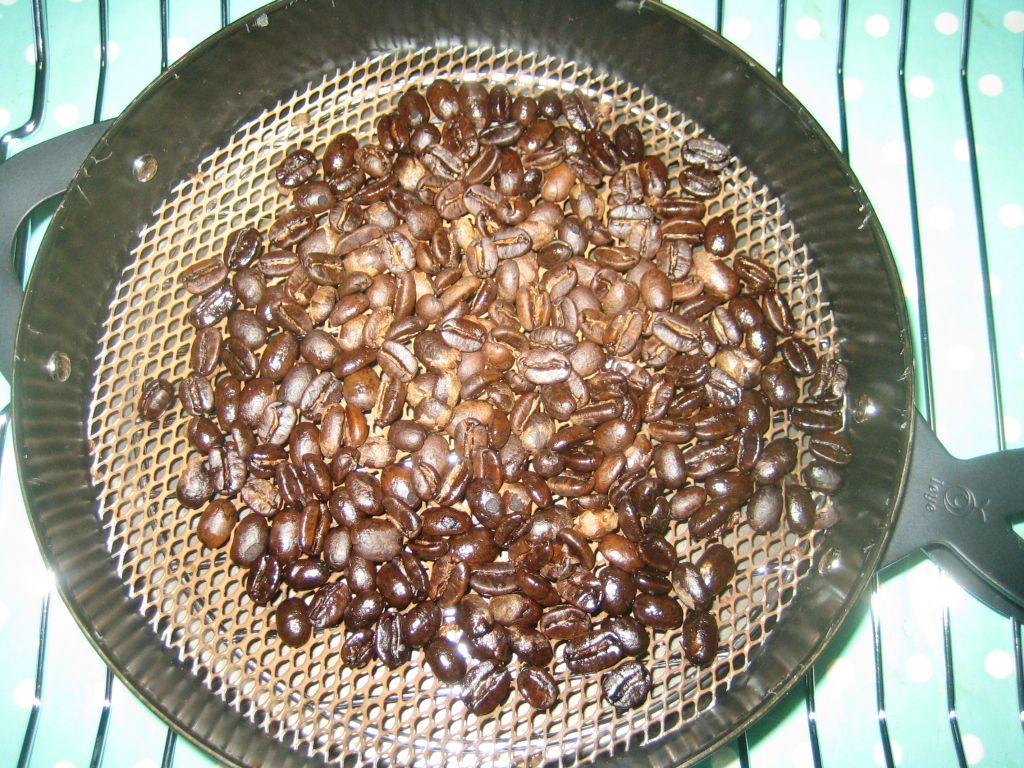 次にダッチパンでの焙煎で、これも直接豆を置くには、と思い、コーナンで魚焼き網を丸くカットして底に敷きその上に20gほどの豆を敷き蓋をして、火力を中にして5分加熱、3分余熱しましたが、十分では、なかったので、再加熱4分でなんとか焙煎できましたが焼きむらが出ています。手前側が深煎り状態になっています。これは、おそらく上部にバーナーの形状がコの字になっている影響だと思われます。豆の上にも何か敷いた方が良いかも知れません。