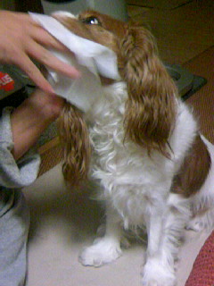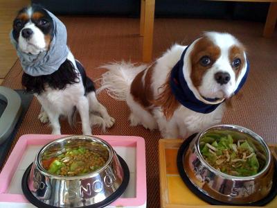 午前8時 朝ごぁ~ん 鶏のムネ肉のゆでたの ブロッコリーのゆでたの キャベツのゆでたの ニンジンのゆでたの ドッグフードをみんなまぜまぜ ルフィさんには、心臓の薬とグルコサミンのサプリ れもんさんには、目薬とグルコサミンのサプリ 入り。 お皿は、ピカピカルフィさんは、ご飯のテーブルまで舐めてます。午後1時 みんなでお散歩 だんなさんからおやつをもらってますね~ 「もっと、ちょーだいっ♪」ってお顔のルフィさん家に帰って、だんなさんに足を洗ってもらって、またおやつもらって、楽しい一日だったね~