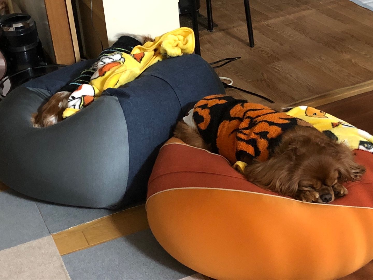 早朝の わんこさんたち夜は、ビーズクッションで寝るロビンと葉月どうしても ビーズクッションが良いらしいですコストコでわんこさんのベッドを買っても多分使ってくれないだろうなぁ…今日の ロビンと葉月のお洋服はおそろいの迷彩柄パーカーこれも5枚1000円くらいで買ったやつだよちゃんと裏起毛で あったかいし安いし すごく役立ってくれてます〜にほんブログ村