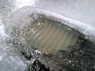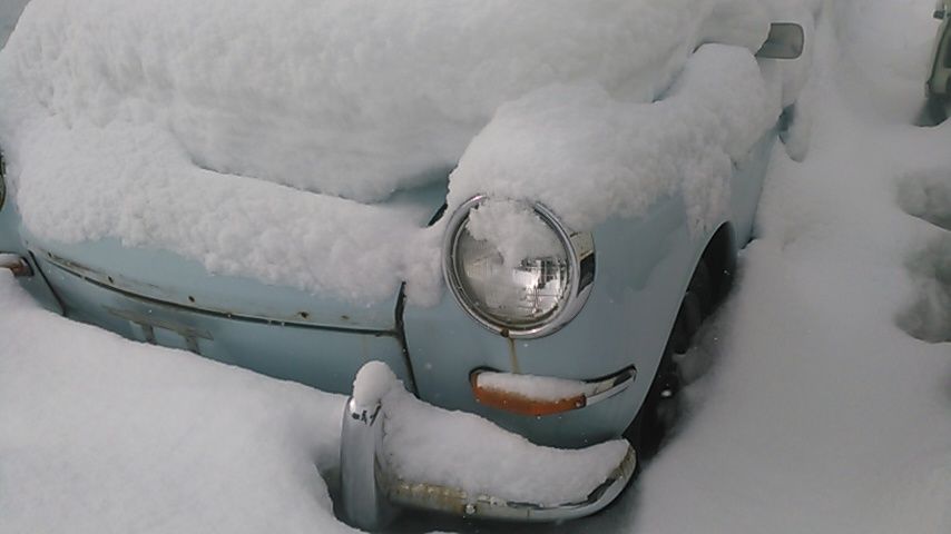 なかなか、車庫の中の氷はとけないのだけどナタでタイヤの周りを割って、お隣のおじいちゃんにも手伝ってもらって半日かけてどーにか車庫から出しましたタイヤが埋まってた穴はこんな感じまだまだ、氷はとけないんだろうなんで、一応診てもらうかー、と山奥まで行ってまいりましたそして、「晴れた夏の日しか乗らないでね」と、お墨付きをいただきましたツルツルでございますはー、どっかに落ちてませんかね、タイヤ。早く万全にして乗りたいわ