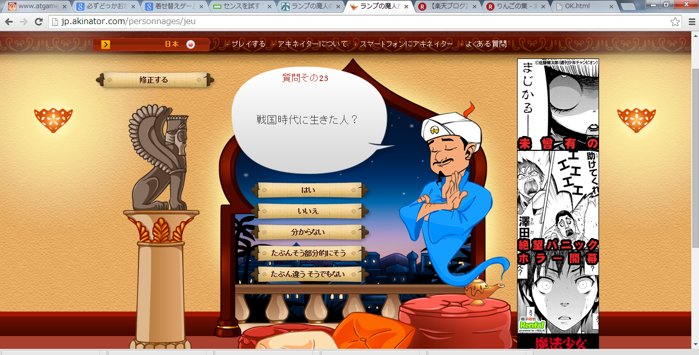 青いランプのおっさんに聞けばいいのでは……?と思いつつある自分。地味に最初に設定している人と認識ずれていると、他の人達が違う選択したら少しずつバイヤスかかって変わってくれないかなあと思ってしまう。ちなみにこれはかごめちゃんをやった時。「どちらともいえない」ってある意味結構大事だと思う。7種でやってみたら主人公だと思ってたキャラが地味に主人公認定されてなかったりして凹んだ。