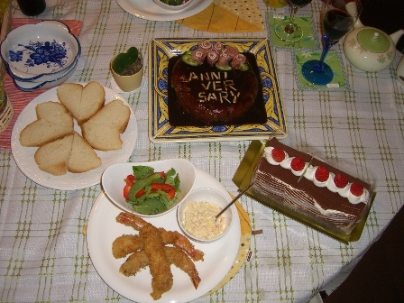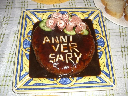 今日はエイプリルフールですねぇ本日、ワタクシ結婚記念日でございましたぁ 早いもので、もう1年も経ってしまったのですねぇ自分で言うのもなんですが・・・ 相変わらずのラブラブ夫婦ですよ~ (コイツ(゚Д゚)ウゼェェェ さてさて、本日のディナーですが・・・ こんな感じにしてみました メインは、 こちらの、 【ギャル曽根が食べるのかよどでかハンバーグ】 (笑) この量のひき肉をコネるのはなかなか大変でしたバラの花=生ハム、葉=キュウリ、文字=チーズ もちろんソースも手作りよ あとは、【普段は絶対買わない、大きいエビを買ってエビフライ 手作りタルタルソース・プッチーナのサラダを添えて】 プッチーナって初めて買ってみたんですけど、ほんのり塩味で、プチプチしててものすごくおいしかったです そして、 【フランスパンハートの形に盛り付けて・・・ パンは手作りじゃないよ】 と、 【苺のチョコバナナロールMADE IN コージーコーナー】 以上がメニューになります昨日、パパが 「明日ご飯食べに行こうか?」って言ってくれたんですけど、 行きたかったお店が木曜休みだったのです記念日の外食は、また近々行く予定なので、 今日のご飯は普通にしようと思ったんだけど、せっかくの日にいつもと一緒じゃねぇって事で、ハンバーグとかエビフライとかいつも作るけど、盛り付けでごまかしてみました(笑) エイプリルフールが結婚記念日・・・・嘘クサイ(。-д-。) ですか 詳細は明日~~