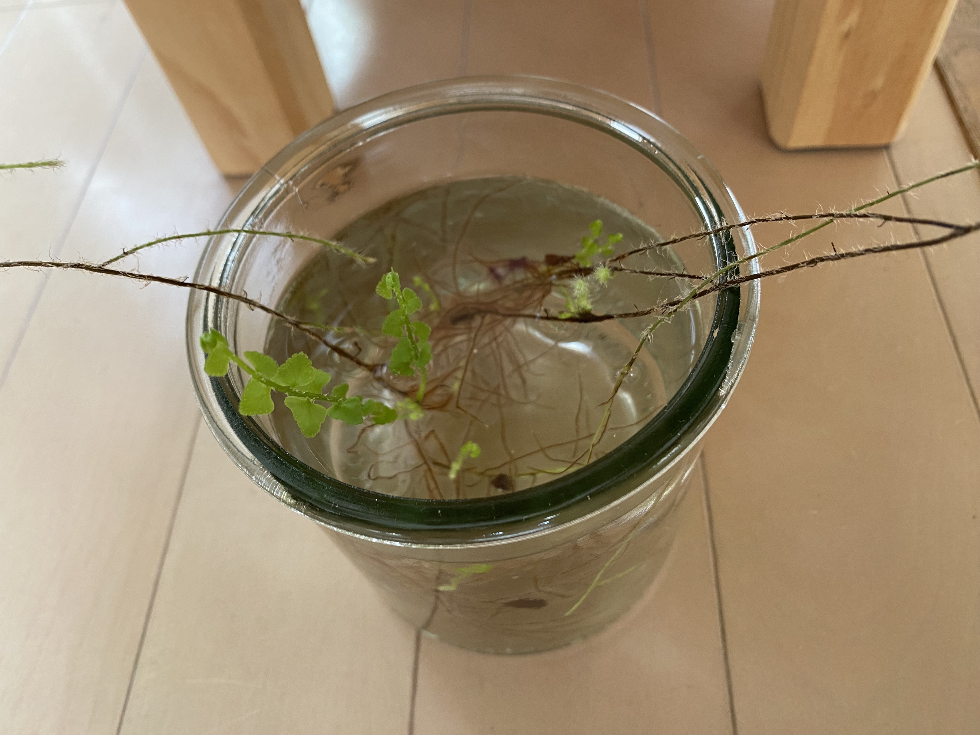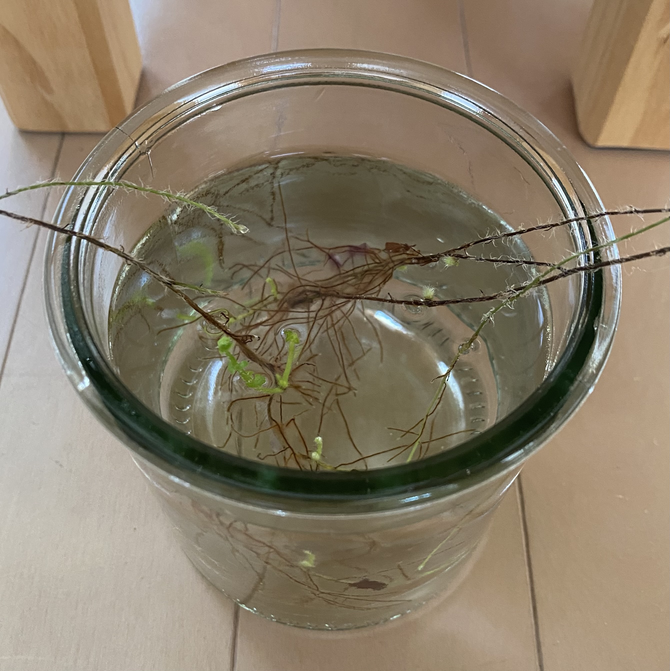 一週間前の朝にお届けした「わが家の観葉植物たち」の注目株である「ネフロレピス ダッフィー」のその後ですお知らせのように…やっている(観察している)ことは「ランナーと呼ばれる蔓のようなものを伸ばして、その先で発芽させる方法」で 伸びてきたランナーの先を、水につけておくだけの手法となります…ということで、現在の様子はというと一週間前と同じように、水に浸かっていたランナーの先からワシャワシャと根が伸びてきていて先週からの変化としては、ちらほら発芽したところが成長してきている感じです※ 観察中のネフロレピス ダッフィー(浸漬後3週間) 浸漬する容器を大きくしました※ 観察中のネフロレピス ダッフィー(浸漬後2週間)あと、あわせてお届けしていた「ガジュマル」については順調に成長しておりまして、また鉢替えが必要となったころにお届けできればと思います