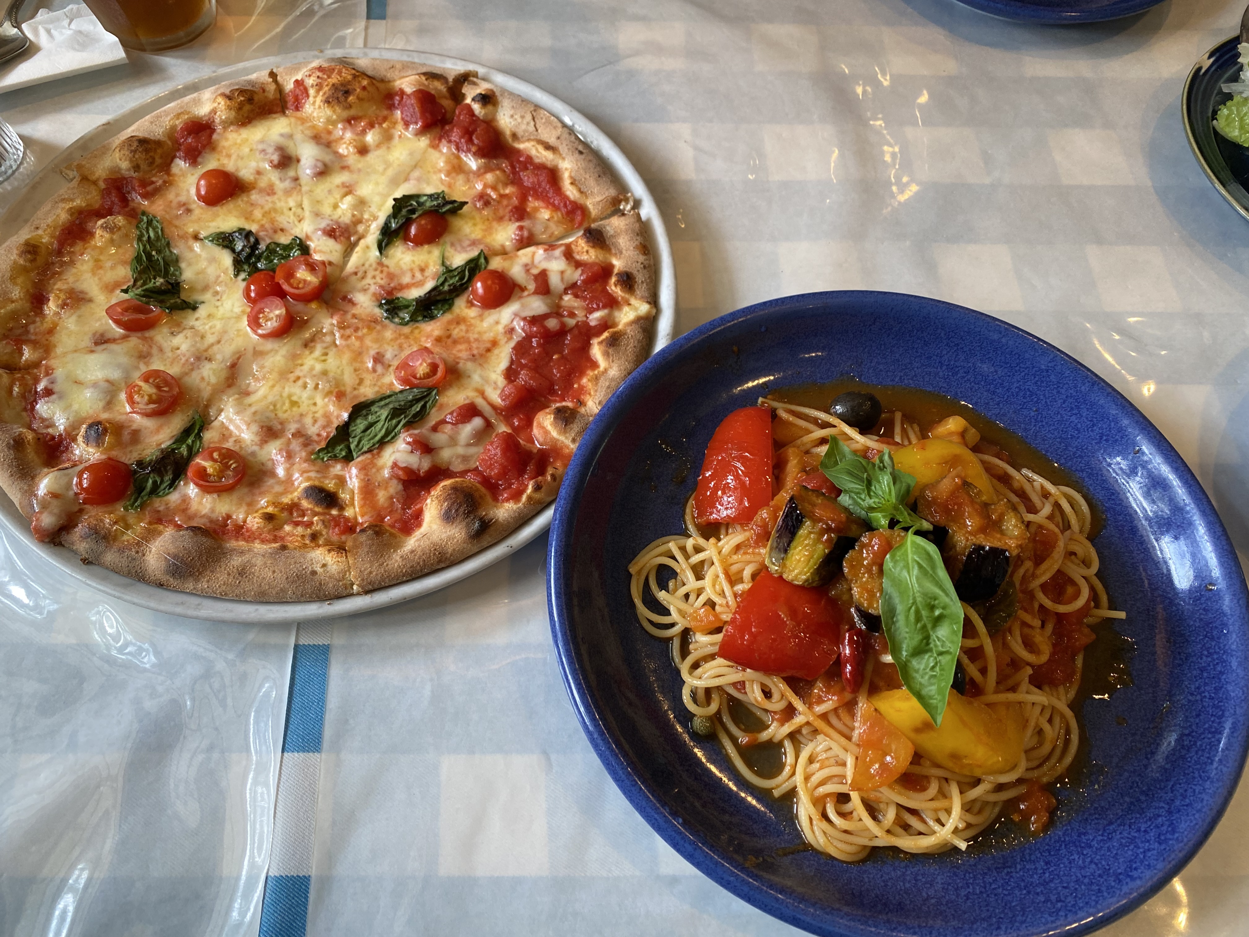 昨日につづいてこの表題からのお届けとなります昨日は「また行きたくなる店!準レギュラー入り」へと昇格している「台湾料理屋」の内容をお伝えしたばかりでありますが…引きつづき今日も「準レギュラー枠」に登りつめそうなお店との出会いがあったのでそちらの模様をお届けしたいと思います休日ルーティンの「日用品の買い物」がてら、いつものように向かった先で昼食をとろうと今回候補に挙がったのは「イタリア料理」だったんですねぇ身近なところではチェーン店のお店はいくつかあるのですが、チェーン店で食べるのであれば家で作った方が…というところがあって(それほど自作に自信があるわけでもないですが…)…なので、せっかくなら専門店でという思いがあったんですねぇそんなこんなで、助手席に座る妻がネット検索をしてみたところ隣町に「イタリア料理店」があって、若かりし頃⁈…四半世紀前くらいに行ったことがあるよってことで向かってみることにしました幹線道路から少し外れた住宅街へ入ったところにお店があって到着してもまったく記憶がよみがえりませんでしたが…店内に入ってお店の感じやメニューからあぁ~確かに一度来たことがあったなぁ~と思い出すものでしたさらにその記憶を確かなものとしたのが、このお店の特徴であるセットメニューなんですね!主品に「サラダ+アンティパストのセット」を注文すると20種類のおかずが食べ放題に!そうそう!ここのお店は、主品(パスタやピザ)が来る前に配分を考えておかないとサラダとアンティパストだけでお腹いっぱいになってしまう店でしたぁ~…てなことで、今回は四半世紀前より賢くなったのか(いやっ…単純に食が細くなっただけ⁈…)後のことを考えてしっかりと調整したつもりでおりましたがぁ…結局、てんこ盛り⁈……ほどなくして、「パスタ」と「ピザ」が提供されました!パスタは「シシリア風スパゲティ」で、ピザは「マルゲリータ」ですいやぁ~どちらも美味しかったですねぇ~!とくにピザは、われわれの好みである「高温の窯で短時間に焼き上げるナポリタイプ」で具材はシンプルでも生地を十分に味わうことが出来ましたパスタについても、トマトソースにナスを使ったシチリア風の王道ともいえる仕様でパスタとソースの絡み具合や塩味がバツグンでしたう~ん…ちょっと、自身で作るパスタの勉強にもなりましたねぇ~ということで、今回はとても堪能しちゃいましたぁ!今までは、なかなか「イタリア料理」ってのは、外食ローテーション枠の位置づけになることがありませんでしたが、今回を機に「準レギュラー枠」になる⁈…かもですぅまた乞うご期待です!