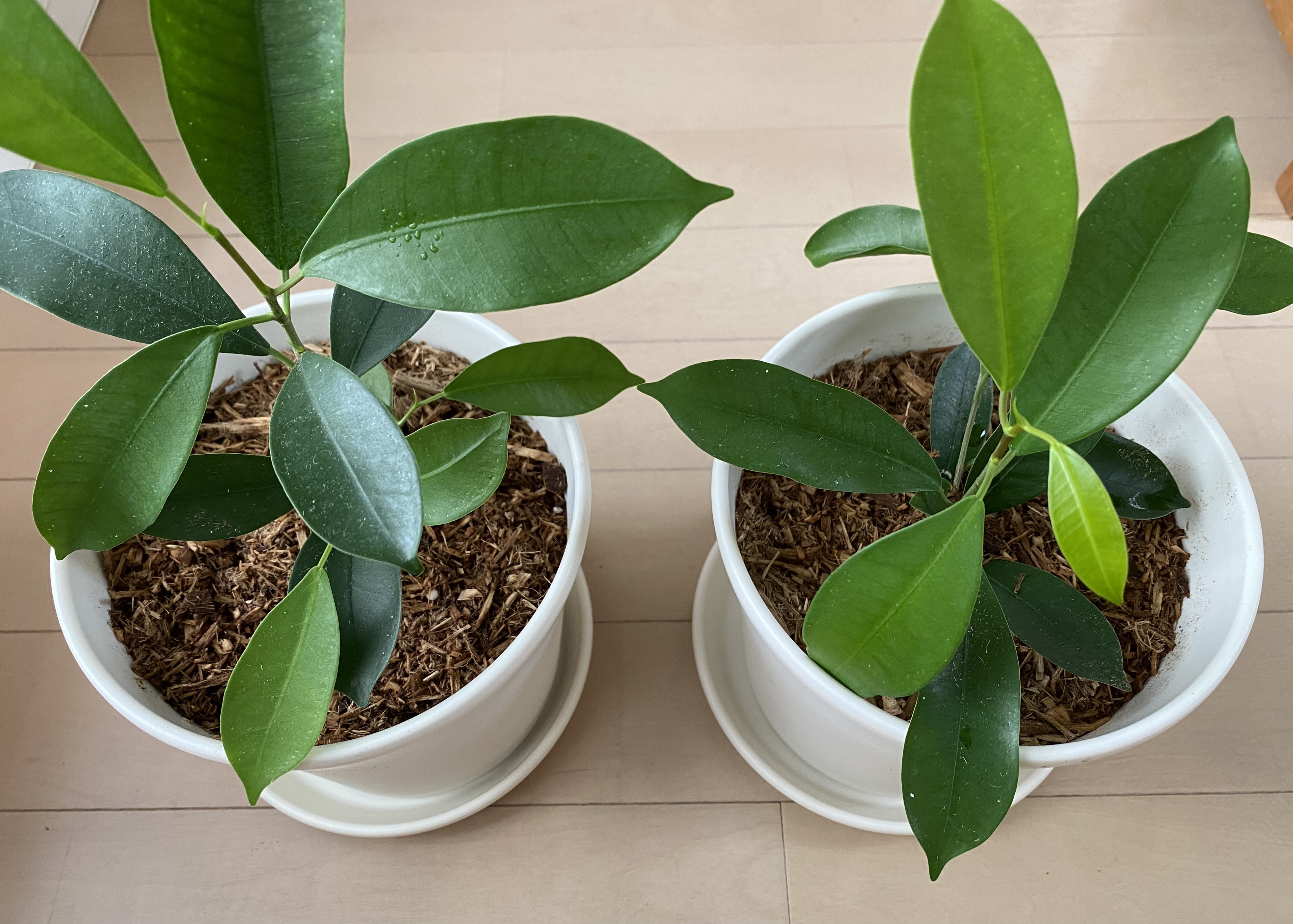 さきほどの「ネフロレピス ダッフィー」「ガジュマル」のほかにも「わが家の観葉植物たち」の構成メンバーにはひそかに成長の歩みを進めている「ベンジャミン」がいるんですねこちらのベンジャミン情報を内緒にしてたわけではないのですが…ちょっと、お届けのタイミングがなかったですね(いいわけ…)そんなことで、この機会にふり返ってみますとベンジャミンについては、6/5、6/6 のブログにあるように『昨年(2023年)の挿し木 成功体験』をもとに、なんとかその経験を活かして今年(2024年)の挿し木作業を滞りなく落ち着いて行うことが出来たと思います(…といっても、それほどの作業はしてないですよね…)ということで、さきほどの「ガジュマル」とあわせて本日、2024年ものの「ベンジャミン 鉢替え」をしました!良い感じに鉢替えが出来たので、またこれからの成長を楽しみにしたいと思います※ 2024年もの ベンジャミン(新しく鉢替え) …本家から分家したベンジャミン※ 2024年もの ベンジャミン(鉢替え前) …本家から分家したベンジャミンちなみに、昨年(2023年)も下の写真のように挿し木をして発根に成功していて一年後の現在はこのように大きく成長しております とっても元気です!※ 2023年もの ベンジャミン(挿し木はじめ) …本家から分家したベンジャミン※2023年もの ベンジャミン(一年後の現在) …本家から分家したベンジャミン毎年、その年の挿し木をたのしみにしながらいつかは何らかのプレゼントであったり贈り物とかに出来たら良いなと思っているところです!ちょっと、もらえると嬉しいと思うのですが、人それぞれですかねぇ~⁈…