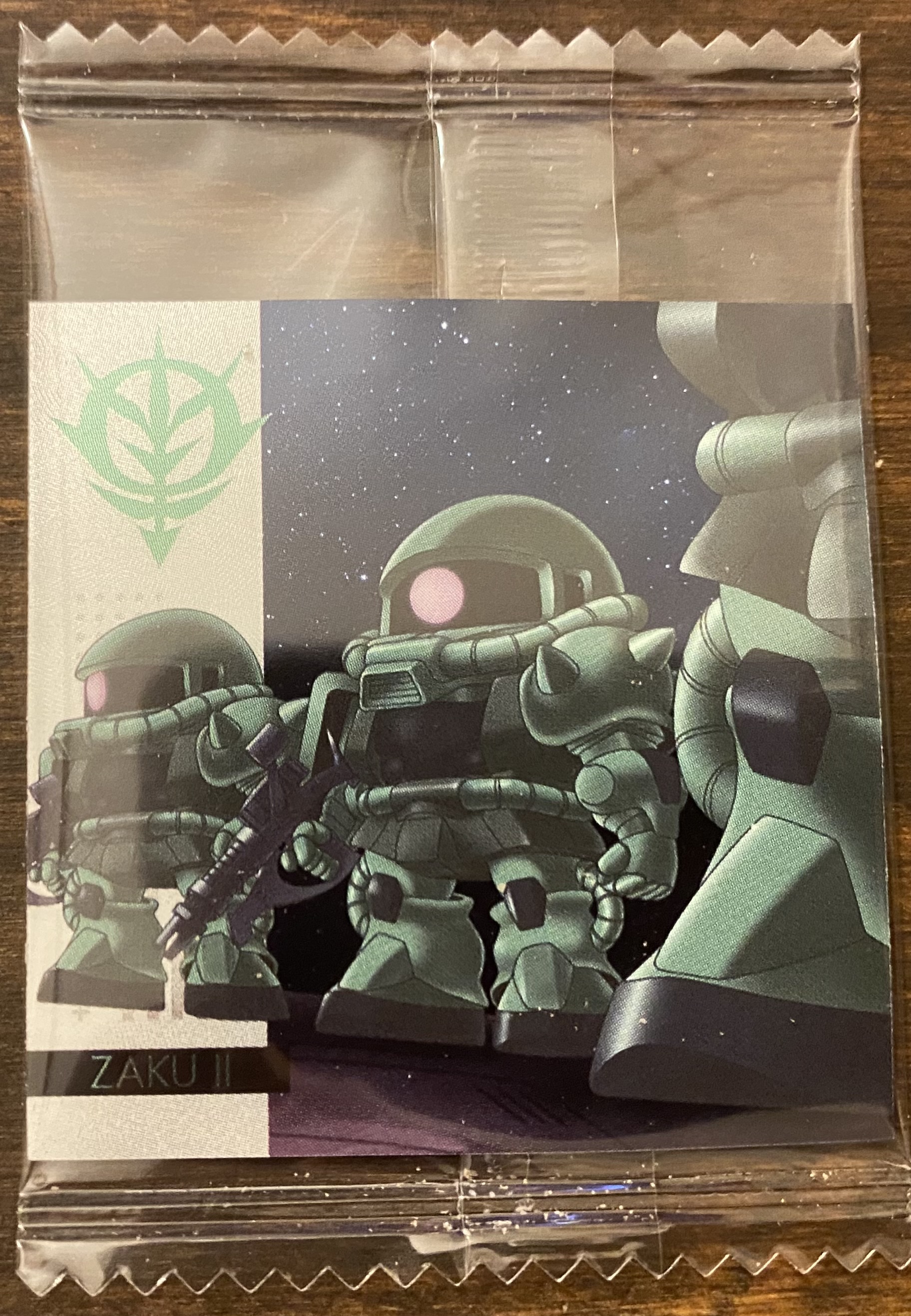 「にふぉるめーしょん 機動戦士ガンダム シールウエハース ~戦いの序曲~」のその後ですちょっとご無沙汰の報告となってしまいましたぁ……というのも、あれから妻もわたしも全く引きがなく全戦全敗だったのでお届けするネタがなく間があいてしまった次第でありますぅ…いやっ、そもそも『ファーストガンダム狙い』でなければシークレットも出ているので全敗ということではないのかもしれませんが…そんな日々を送りながら、『妻とわたしのどちらが引き当てが強いか』と競い合っていた『小さな譲れない戦い』は地味~に続くのでありましたもちろん『毎度の開封儀式』は忘れずに! 願いはひとつ!『シャア専用ザク』『量産型ザク』の2つのうちどれか出てくれっ!と…すると…な、な、な、なんと…妻が…つ、つ、つ、ついに『量産ザク』を引き当てましたぁ!やっぱり、妻は引き当てる力をもっているんですねぇ~う~ん…残るは『シャア専用ザク』最後はわたしが引き当てたいものです!まだまだ戦いは続くのでありますっ!