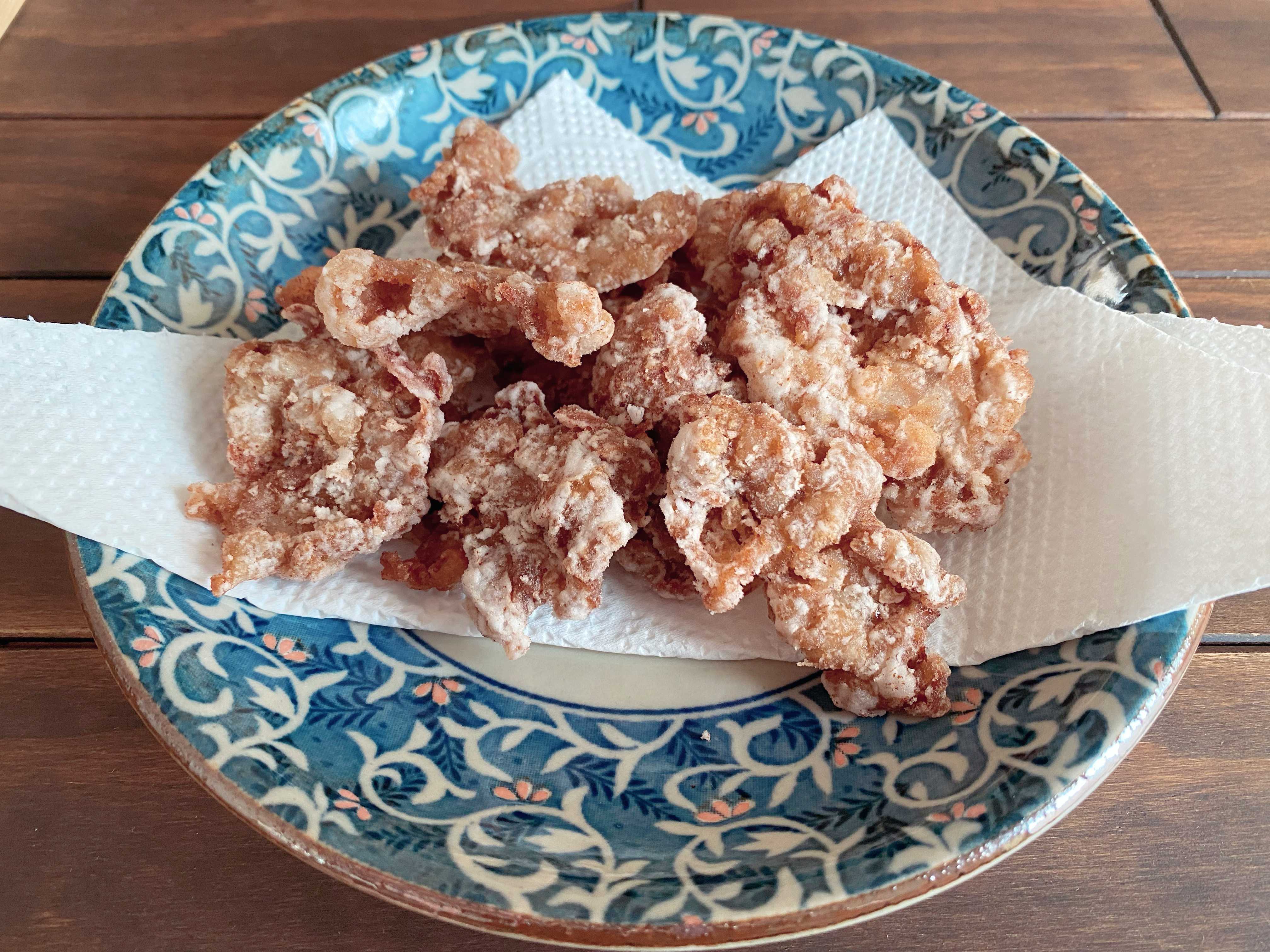 昨日は「観葉植物の鉢替え」に時間を割いたのでcookingは臨時休業でした… ※そのもようは別ブログにてお届けですそんなことで、今日は通常運転となります 昨日の買い物で「豚のバラ肉」を少し多めに買ってきていたので、久しぶりに(7/2以来)好評だった「豚肉のカリカリ揚げ」を作ってみました前回は、味付け無しで揚げて後から甘酢薬味ダレをかけるものでしたが今回は、醤油・にんにく・しょうがの下味を付けたあとに揚げてみることにしましたう~ん、しっかり味がついてカリカリ食感で口当たりが良いので、ごはんがススム感じですぅ!あと、今日のスケジュールではこのあとに「はじめてのスコーンづくり」も予定しているので、後ほどお届けしたいと思います