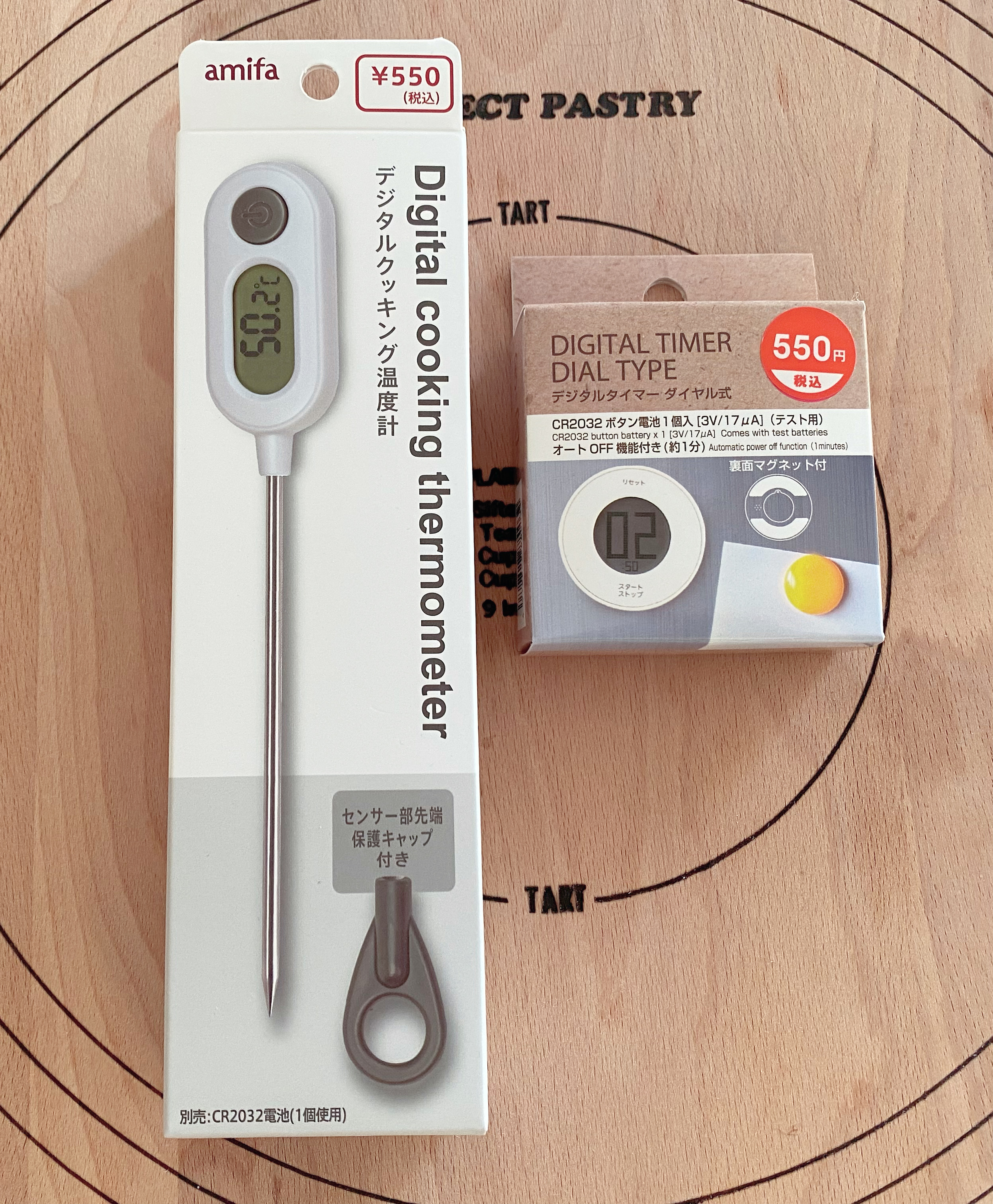 さきほど、「スコーン」のお届けの際に時間経過ごとの状態確認をしていたのですがその時間計測に使ってみたのが新たに「わが家のキッチン スマート計画」の一員となった「デジタルタイマー」ですッ!スマホで代用できるのでは⁈…とあると思いますがいままでのcookingを通じて、やはり、別にあった方が便利だったんですね(スマホで、レシピをみたりありますしね)100均で買ってみました!でも、¥550でしたけれど…あと、あわせて今日のスコーンづくりでは「生地の温度変化」も調べていたんですねやはり、一定の製造条件があってこそ安定したスコーンができるんじゃないのかなと思ったので、試しに計ってみましたそこで、それに用いたのがこちらも新たに一員となった「デジタルcooking温度計」ですッ同じく100均で買ってこちらも¥550でした…ん⁈…100均だったよねぇ〜たしか…でも、お買い得でしょうかねちなみに、今回の「スコーンづくり」のデータです 環境 21.3℃ 50% バター混ぜ込み 16.6℃ 生クリーム混ぜ込み 17.0℃ 生地一次形成 18.2℃ 生地完成 19.1℃ 冷蔵庫保管(生地寝かし) 9:40〜11:30 最終生地(型抜き前) 13.4℃※ データから読み取れることとして やはり、手が加わると温度変化が伴って、生地への影響は少なからずありますかね あと、キッチン環境の温湿度も季節変化による影響はありそうですね きっと、今が一番良い感じの温湿度で望ましいところですかね 夏場は、バターがすぐ溶けちゃいますしね…ちょっと、製造のアイテムが増えたので、これからも楽しくつくって行こうと思います