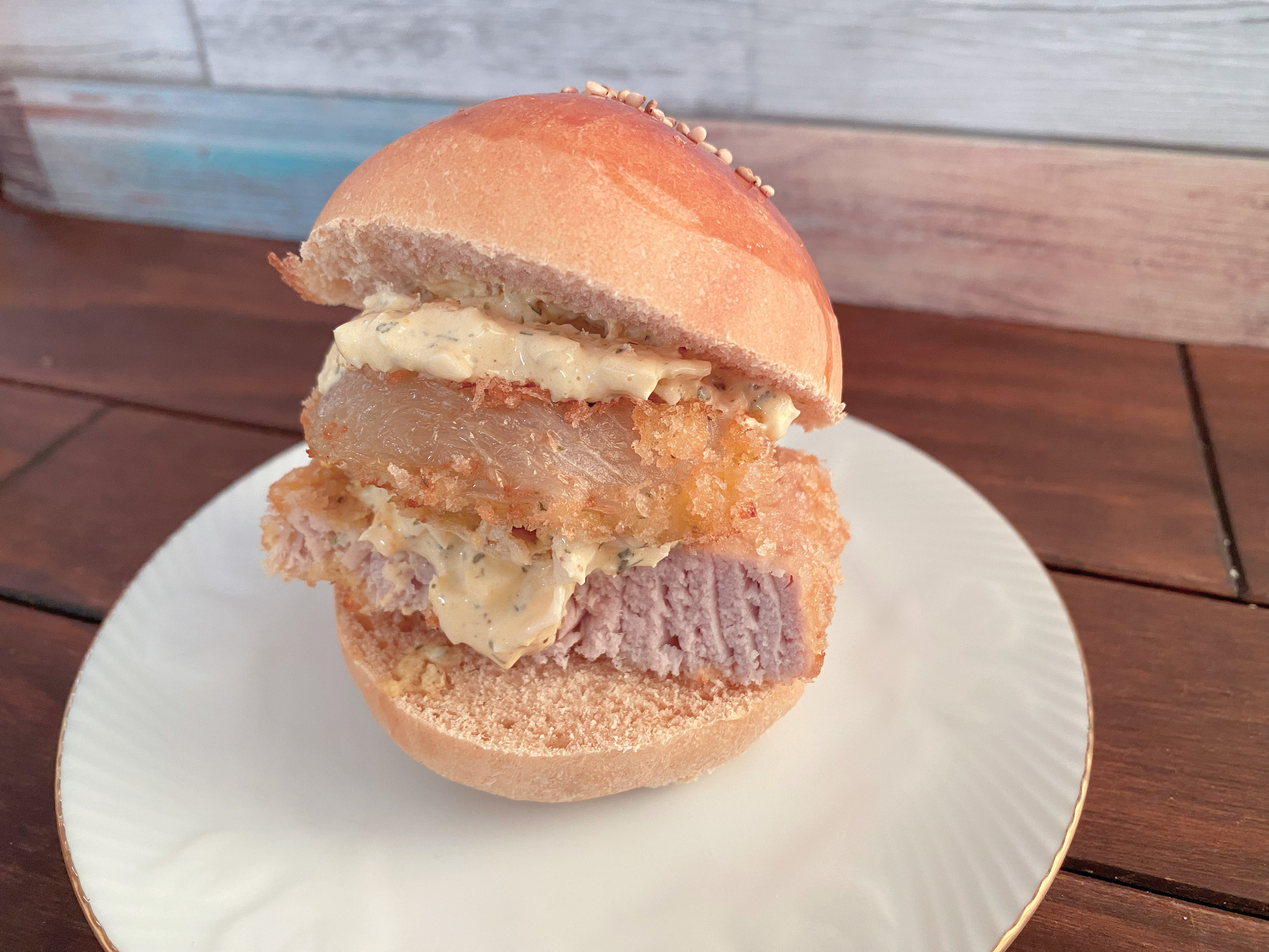 さきほどの『マグロカツ』をサンドしてみましたッ!それと、せっかくなので『玉ねぎのフライ』もつけてあとは『タルタルソース』ですねいやぁ〜フライにタルタルですから、間違いないですね!でも、どうでしょうかね〜マグロカツは、ふつうに肉っぽい食感なので若干、ボリューム感があったりしますし少し軽く食べたいなぁとしたら白身魚のフライにタルタルの方が、ベストマッチかもしれないですねあと、見た目の問題で…写真のように、軽くサンドした状態だと嵩が高くなりますが食べるときに、ペシャンコにしてしまえばそれなりにバーガーっぽくて、食べやすくなったのであります