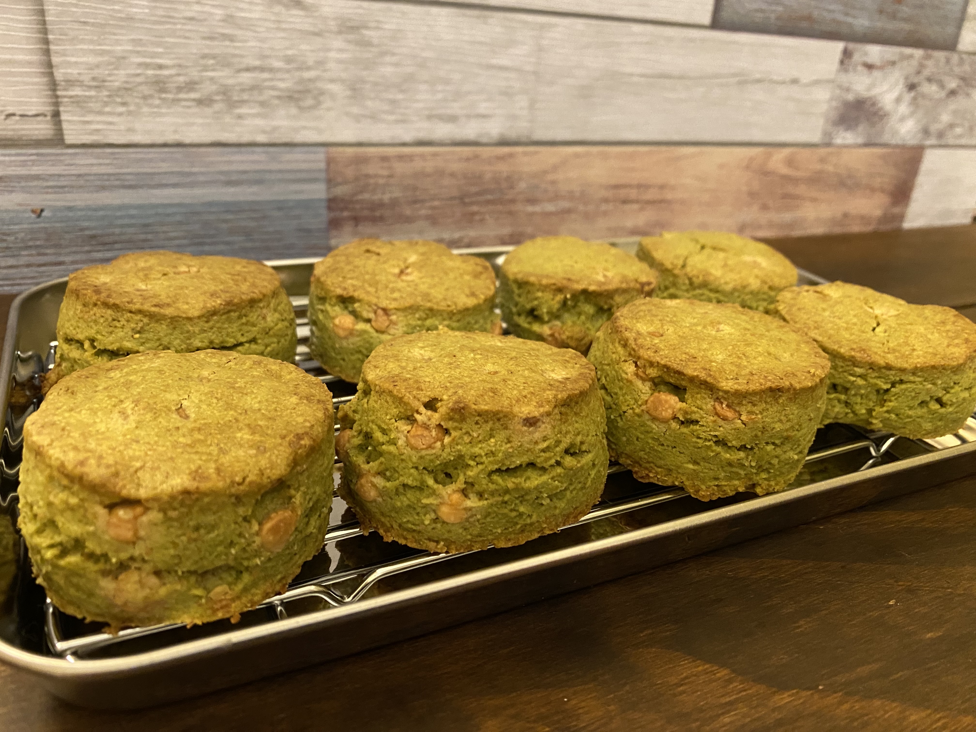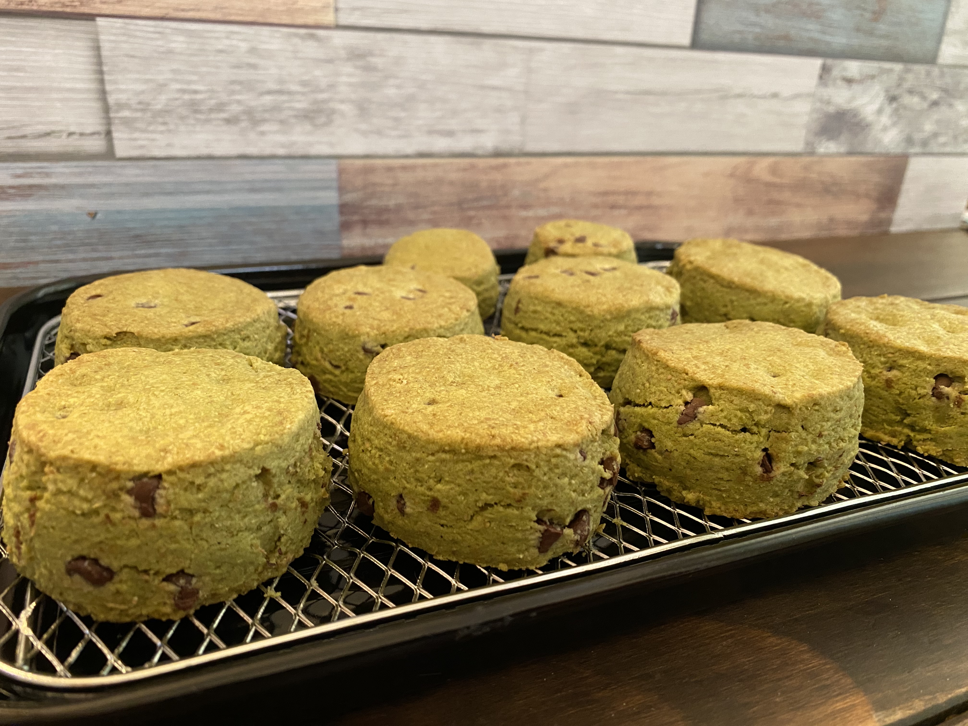 つぎは新作の「抹茶&チョコチップ」のスコーンとなりますッ!いままでに、『わが家のスコーン配合』についておおよその目処がついてきたのでちょっとアレンジしてみることにしました以前、ティラミス用で「抹茶パウダー」を買ってあったのでそれをつかって、はじめてのトライとなるものでした(※ティラミスの抹茶仕様は、いまのところ未実施です)うん、うん、焼きあがりまでは何とか安定した仕上がりになりましたッ!あとは、味わいのところですね…さきほどの「ザクチョコ&クルミ」のスコーンとあわせて『スコーン博士』による判定となりますのでまた後ほどお届けしたいと思います