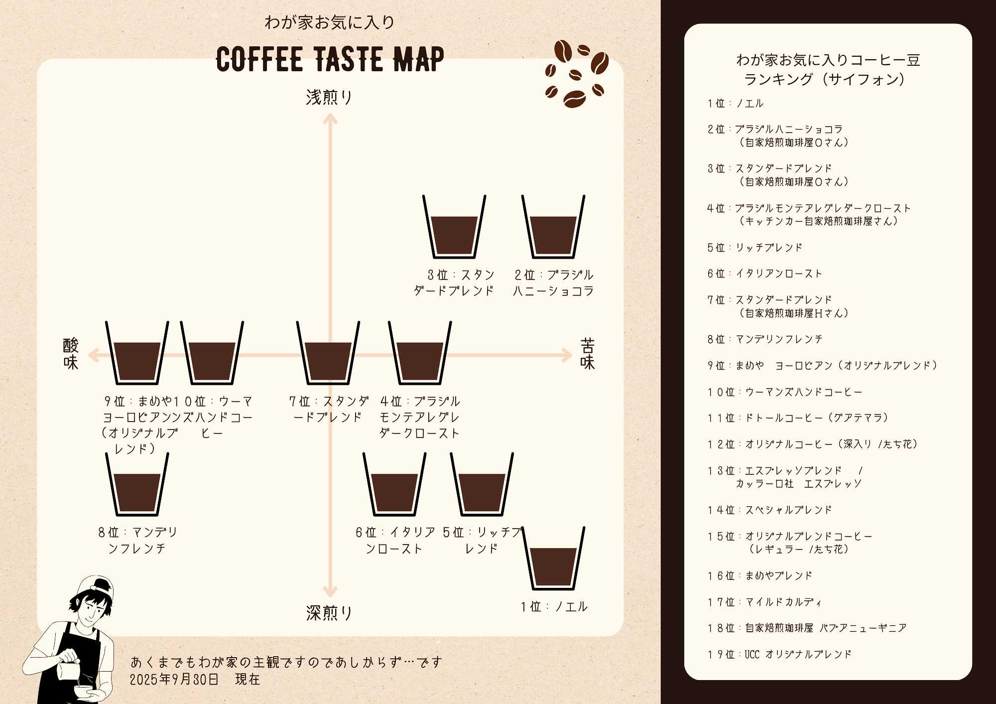 さきほどの「塩麴」につづいては「わが家お気に入りコーヒー」のお届けです昨日、ちらっと、お伝えしていたように一か月半ぶりに「わが家お気に入りコーヒー豆ランキング」の報告をしていってみたいと思いますここ最近はいろんな「自家焙煎珈琲屋さん」との出会いがあって、それぞれオリジナリティあふれるコーヒーの味わいをたのしみながらコーヒーの奥深さをってものを感じているところなんですね今までのわが家好みは「酸味↓・深煎り↗・苦み↗」とあってすごく偏り過ぎている一面がありましたがいろいろと探求していくと「浅煎り」でもすごく香り高かったり、おいしさが際立つ印象深いコーヒーとの出会いがあったりしてとても勉強になっているんですねう~ん…奥が深いですッ何はともあれ、好みの傾向は当初より一貫していると思うのでこれからも、そのあたりを基本にいろいろと探っていってみたいと思います※今回から「ランキング表」と 「コーヒーテイストマップ」でお届けです ↓ まずは「サイフォン部門」となります 以降、以下の部門の報告もそれぞれ 行っていきたいと思います 「エスプレッソ部門」 「ドリップ部門」 「コールドブリュー部門」 「ミルクブリュー部門」※ あくまでもわが家の主観となります