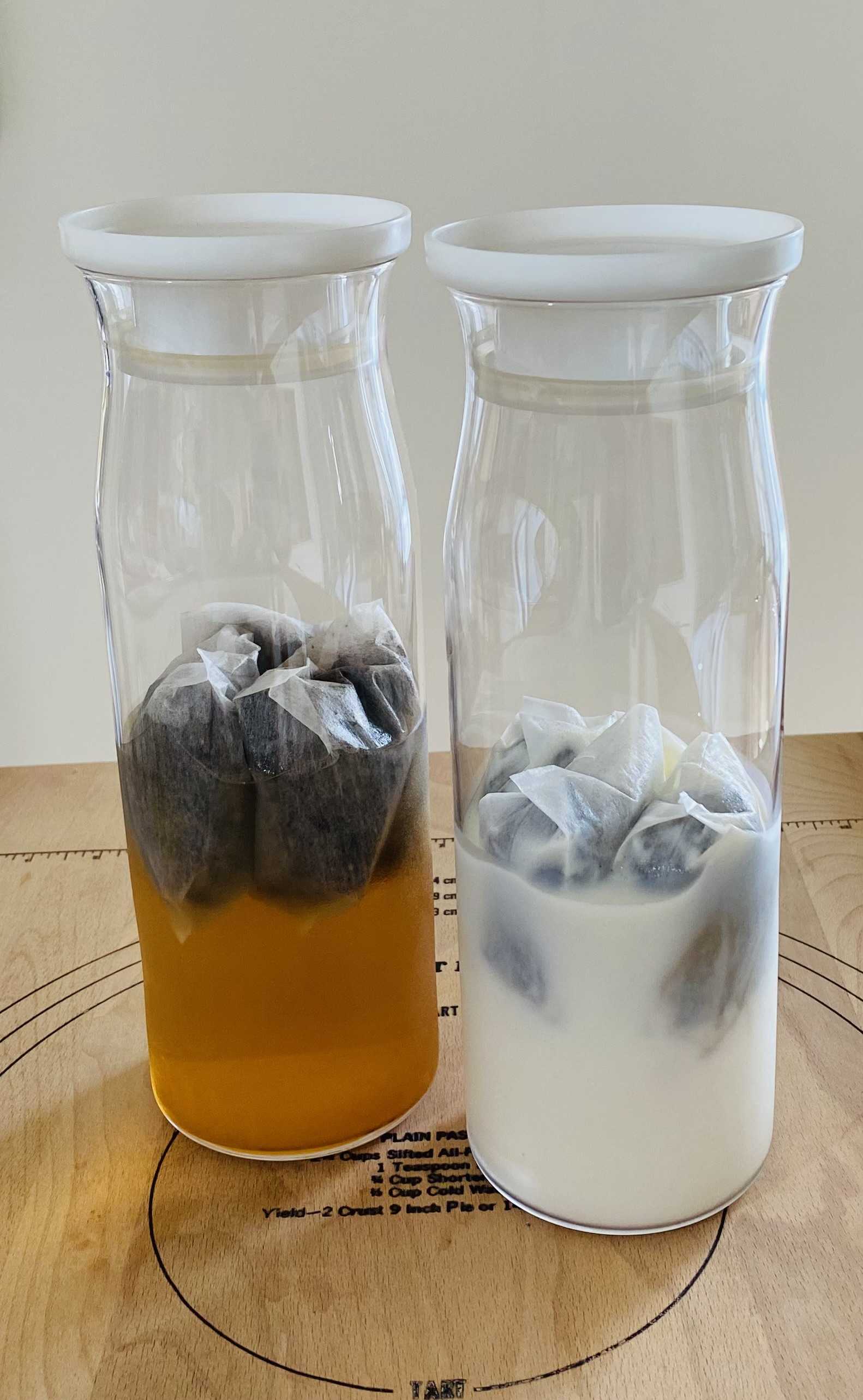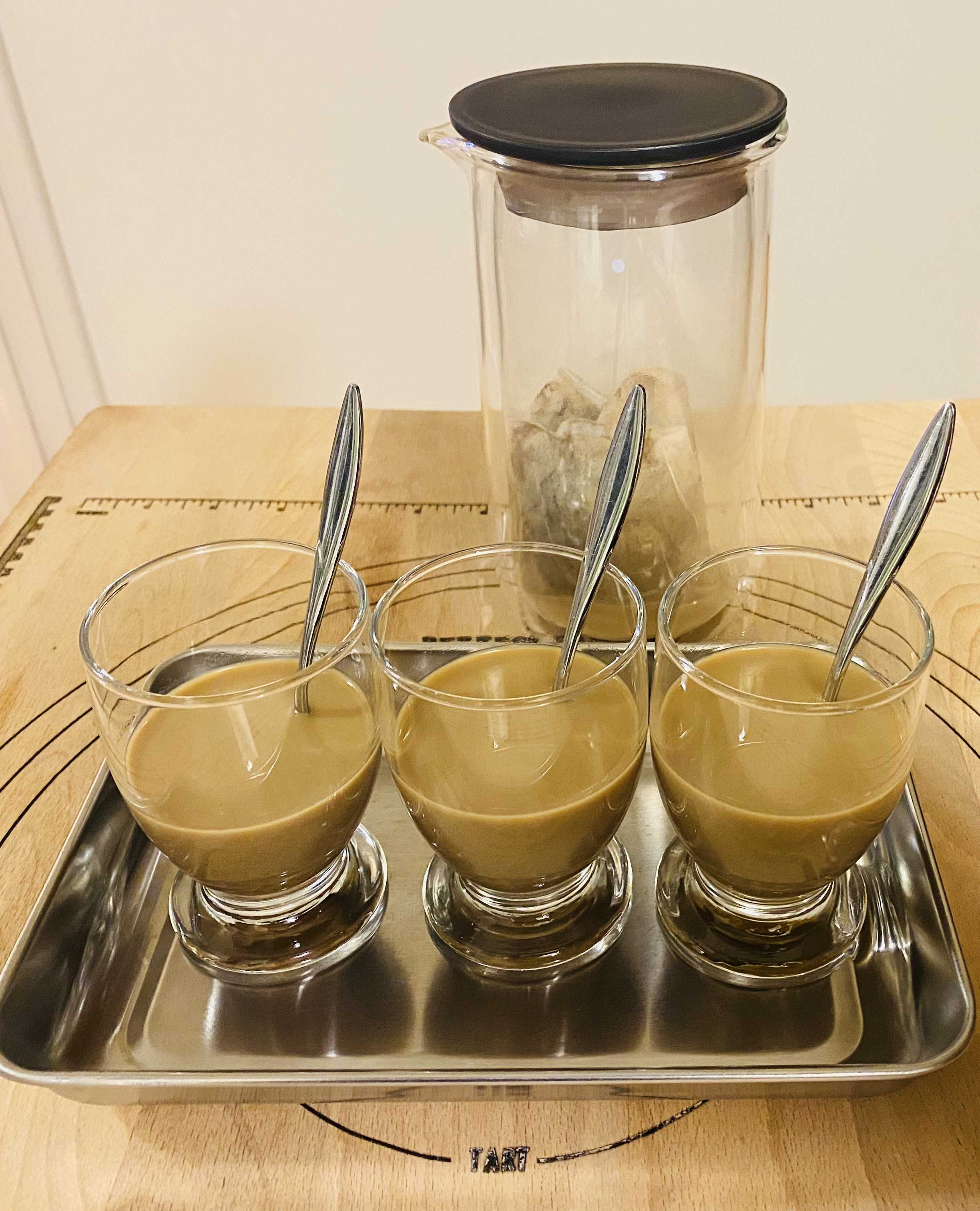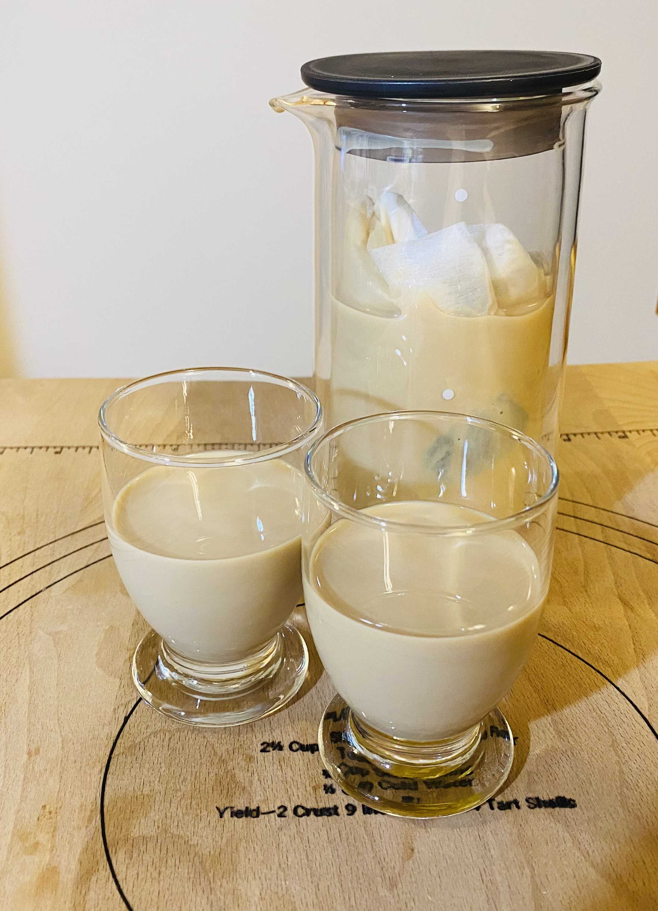 こんにちは今日もなかなかの暑さです…天気予報によればいま日本列島にかかっている前線が少しずつ南下してくるとあって一昨日予想の週間天気どおりに明後日からはこの暑さも幾分かやわらぎそうですでも、天気が崩れるということは湿度があがるのでムシムシとした体感となりますからその点には注意が必要ですね…というところでいつものようにcookingとなりますまたまた引きつづき「ミルクブリュー」です昨日のブログ報告のあと(6時間後 / コーヒー抽出時間8時間)さっそく「飲みくらべ」してみました昨日の検証は以下の条件 ※ コールドブリューと同じ濃度設定 ①「ふつうの牛乳 3.5%以上」と 「低脂肪牛乳 1.2%」のハイブリッド仕様 ②「低脂肪牛乳 1.8%」の仕様結果、「低脂肪牛乳 1.8%」の仕様に軍配ですでも、なかなか甲乙つけがたい僅差の勝負でした(わが家の主観です)①も②も「コーヒーの香り」がしっかり出ているのは同じで(濃い設定が成功!)違いがあるとしたら「ミルクブリューの色味」の具合と「コーヒーの味わいの濃さ」ってところが感じられました(①の方が薄め)(写真) 左:①「ふつうの牛乳 3.5%以上」と 「低脂肪牛乳 1.2%」ハイブリッド仕様 右:②「低脂肪牛乳 1.8%」の仕様 ※ちょっとわかりづらいですね…そんな中、飲みくらべをしながらふと…感想としてあったのがこの仕様のミルクブリューだったらなんらかの甘さが加わるともっとおいしくなりそうな感じがするよね…ってなことになってさっそく、試しに「はちみつ」を入れて飲んでみることにしましたおっ…なかなかおいしいではないですかッ!でも、最後の最後だったので試した量が少なかったものですから念のため、もう一度、しっかり確認が出来るように今日もつくってみました(写真) 「低脂肪牛乳 1.8%」の仕様 250ml 作成そこで今回の確認は以下の3つのパターンの「飲みくらべ」をしてみたいと思います ①スタンダード(甘みナシ) ②はちみつ入り ③ガムシロップ入りさてさて、どうなることやら…なんだか少しずつ「わが家ミルクブリュー」の完成に近づいているのかも…ですかね⁈…
