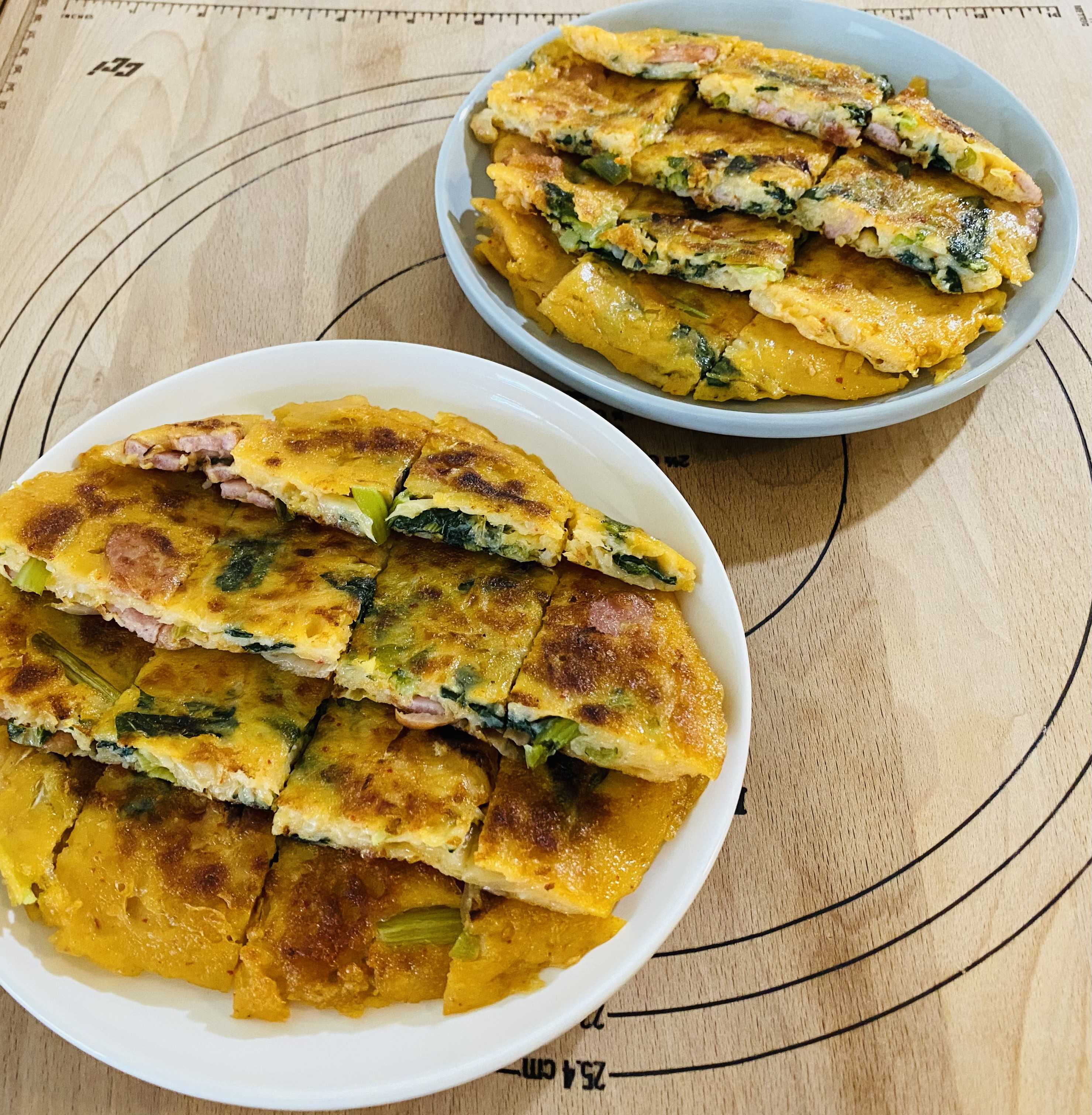 こんにちは昨日に引きつづきどんより空のハッキリしない天気ですね予報のとおり秋雨前線の影響で大気の不安定な状態が続いて急な強い雨や落雷、突風ってところにはほんと困ったものです…ただ気温だけは真夏日にならない30℃を下回っていて、灼熱な暑さは感じませんが湿度がとても高いので、ムシムシした暑さが悩ましいところです……ってことで、お題にありますように今週の週末メニューづくりは延期して代わりに妻がひそかに大好物の「チヂミ」をつくりました…というのも今日の妻は仕事帰りに歯医者で治療があって時間をおいても夕飯はあまり食べられないかなぁ…とあったので、少しでも食べられるようにお気に入りの「チヂミ」にしてみましたちょっとはお腹に入れた方が良いですしね…と思いついたもののあっ…そういえば、チヂミづくりで肝心要の「ニラ」がないことに気づいてはてさてどうしたものかと思ったのですが冷蔵庫をいろいろ物色してみるとそろそろ消費した方が良さそうな「じゃがいも」「小松菜」「はくさいキムチ」「ソーセージ」ってところがあったのでそれらを使ってつくってみることにしましたそうだ!「おまかせチヂミ」ってことにしよッ…ってなことで仕上がりはそれっぽくはなった感じです夕飯に食べてみたいと思います