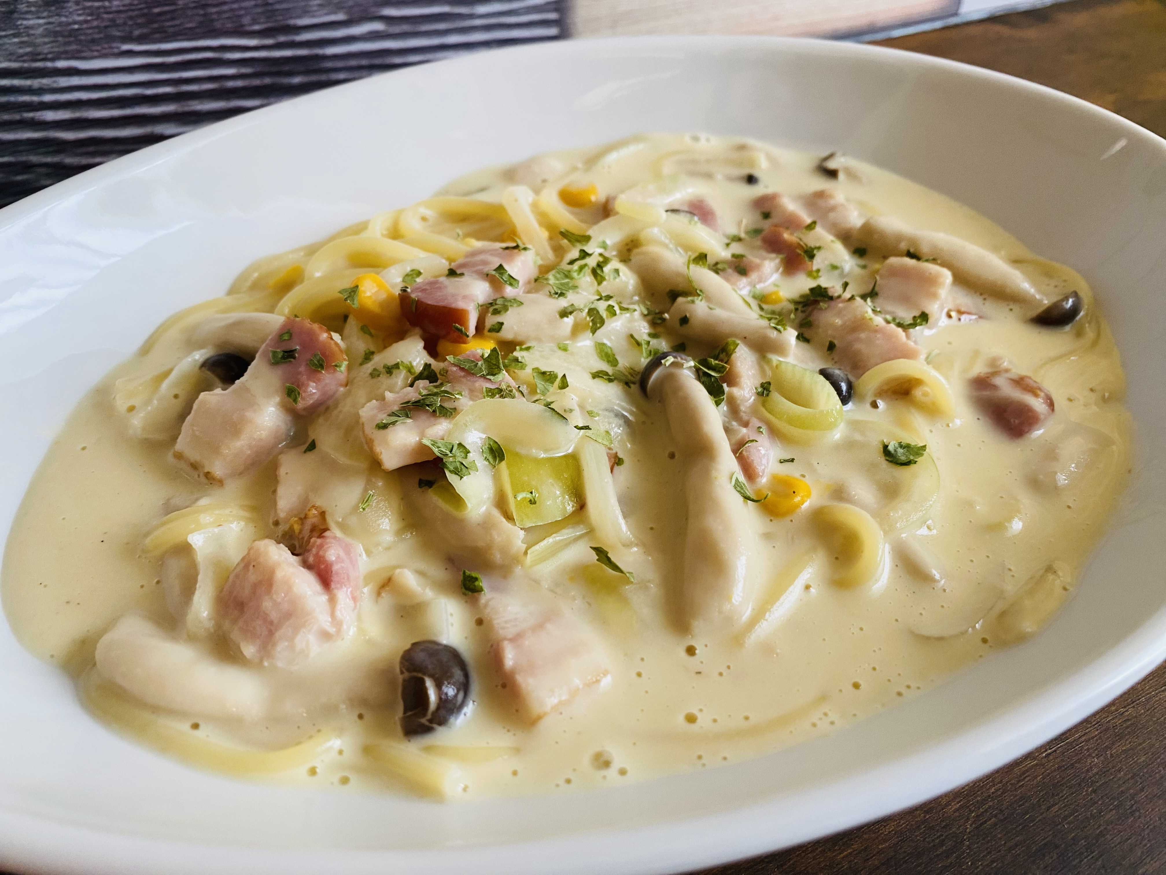 さきほどの「モーニング」につづいてめずらしく「休日おうちランチ」のお届けですッ!今回「コーンクリームスープスパ」をつくってみました…というのも先日「わが家特製コーンスープ」にチャレンジしていて、その後さっそく昨日のモーニングに登場してるところで残った半量は冷凍保存してあったのでせっかくならそれを使って「スープスパ」をつくってみよかなと思ったんですねッちょっとスープのカサ増しのためにさきにホワイトソースをつくってからそこへ「コーンスープ」を足してみましたおっ!良い感じですッなんだかイメージしていた通りにできました