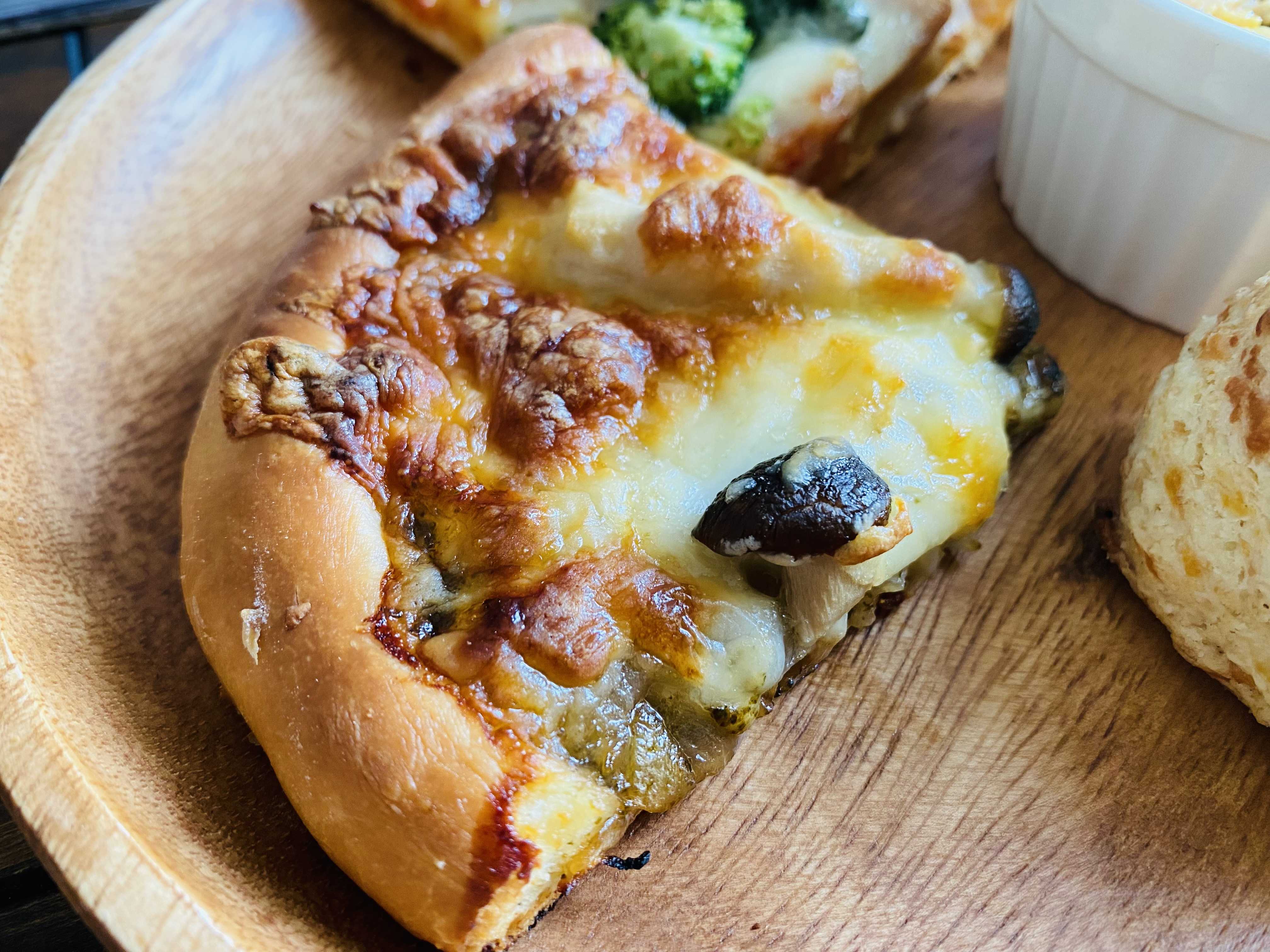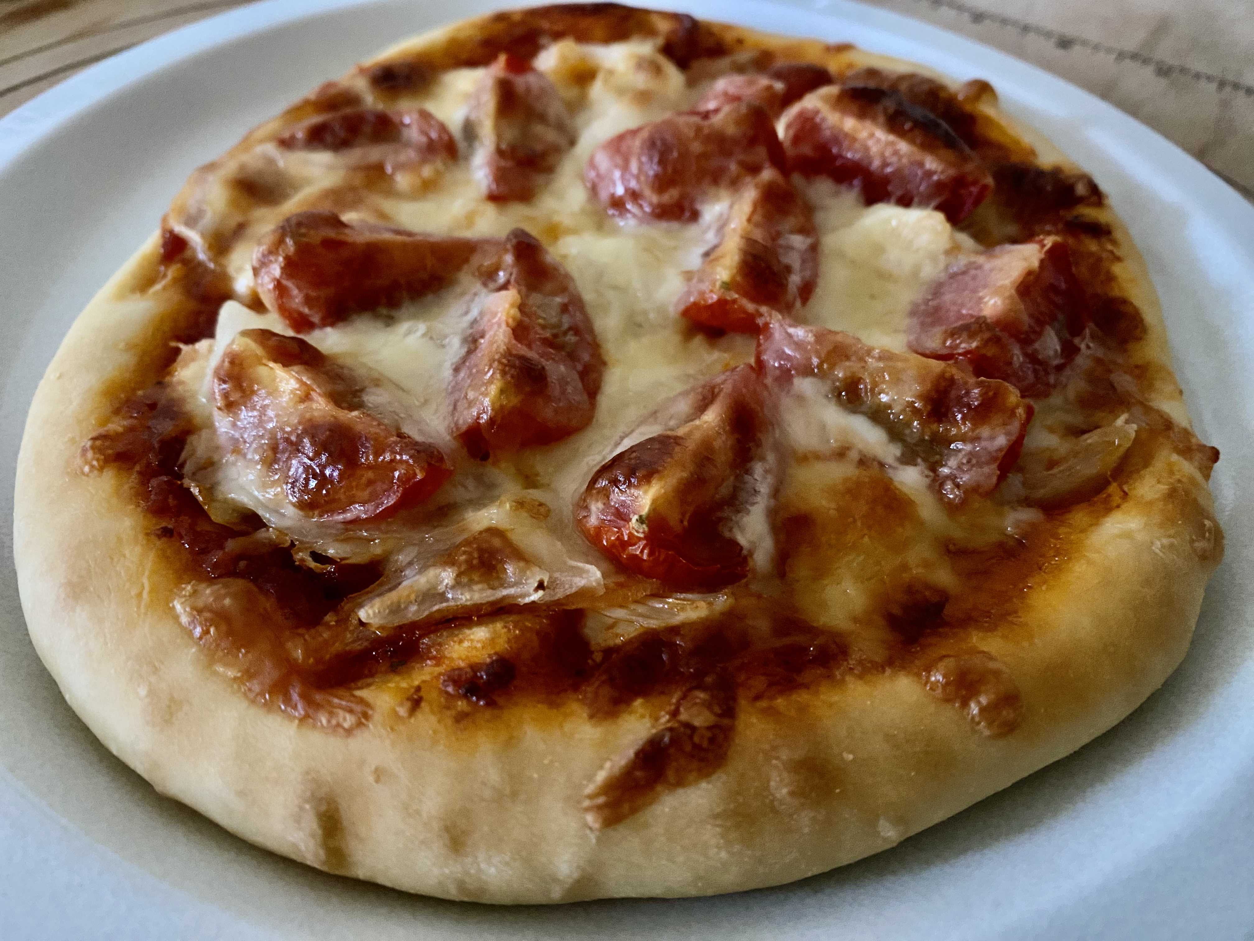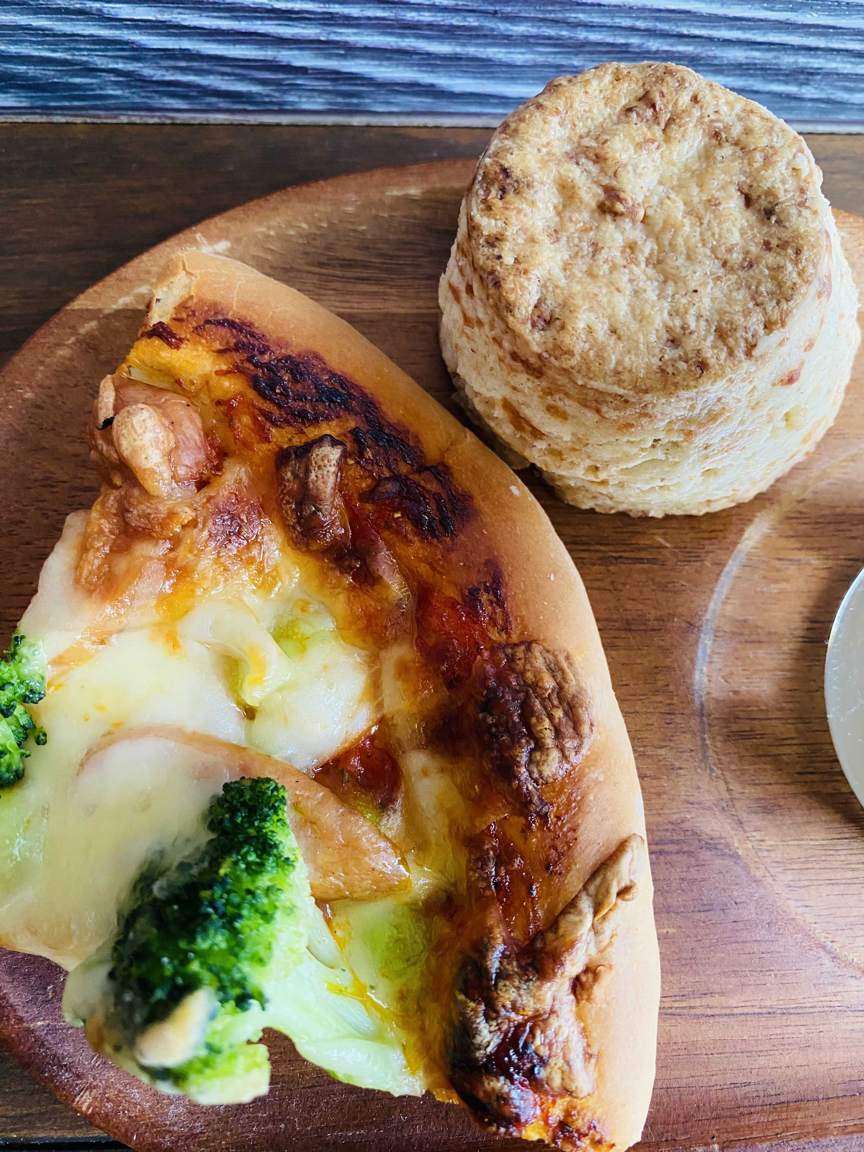 さきほどの続きで「本日のおひとりランチ」のもようです今日はこんな感じにしてみましたはじめてのピザの出来具合は如何に⁈…ってところで食べてみましたッさきほど、仕上りの感じからもう少し生地をのばして薄くした方が良かったのかなと思ってましたが、食べてみたらかえってちょうど良かったです!耳のあたりの盛り上がりがあって内側はほどよく薄くなっているのでアクセントになって良かったですくわえて、生地がおいしかったんですやっぱり「塩麹パワー」ですかね⁈おっと、そうなるとまたもやビギナーズラック⁈…ですね今日つくった生地があと2回分あるのでまた違う具材でつくってみたいと思いますあとで妻に試食してもらわなければです…で、ランチとしては昨日のチーズ入りスコーンとエスプレッソミルクのセットにしてみました