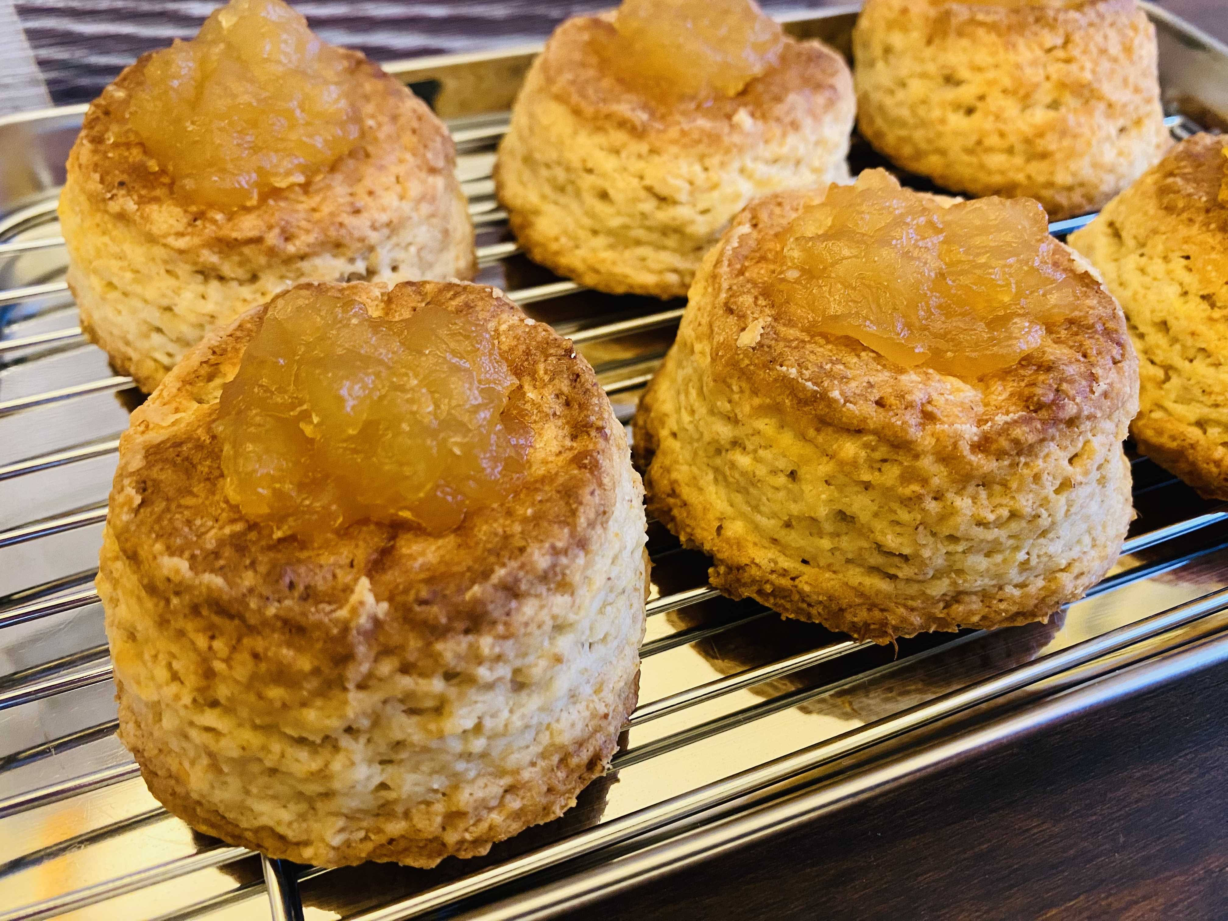さきほどは、昨日のできごとからやり残していたブログをお届けしたとこですでは、いつものようにcookingですね実は今日のお届けはメインとして「スコーン」だけなんですね(あと「にんじんラペ」もありますが…)ん⁈…まだ完全復調ではないのかッ⁈…ですね…そんなこんなの週一回のスコーンづくりは10/15の「キウイジャムのスコーン」に続いて「りんごジャムのスコーン」にしてみました…というのもお手製のりんごジャムをいただいてまだ冷蔵庫で出番待ちをしてたものですからせっかくなので使ってみることにしましたくり返しとなりますがここ最近のスコーンづくりは「栗入りスコーン」のつくり方にならって「ピーナッツバタースコーン」からはじまって「自家製ジャムのスコーン」の段階になってるところなんですねそんなこんなでこちらのジャム入りスコーンは前回のコメントにもあるようにジャムを生地に練りこんでいることから風味と味わいの部分では「素材」を感じることが出来ますが、見た目のインパクトにちょっと欠けてしまっていたんですね…ってことで、今回はそのことをふまえて「果肉(ジャム)」を添えてみることにしました ※焼成時間を調整して 「あとのせジャムの状態」でも加熱さてさて、またスコーン博士に感想を聞いてみたいと思います