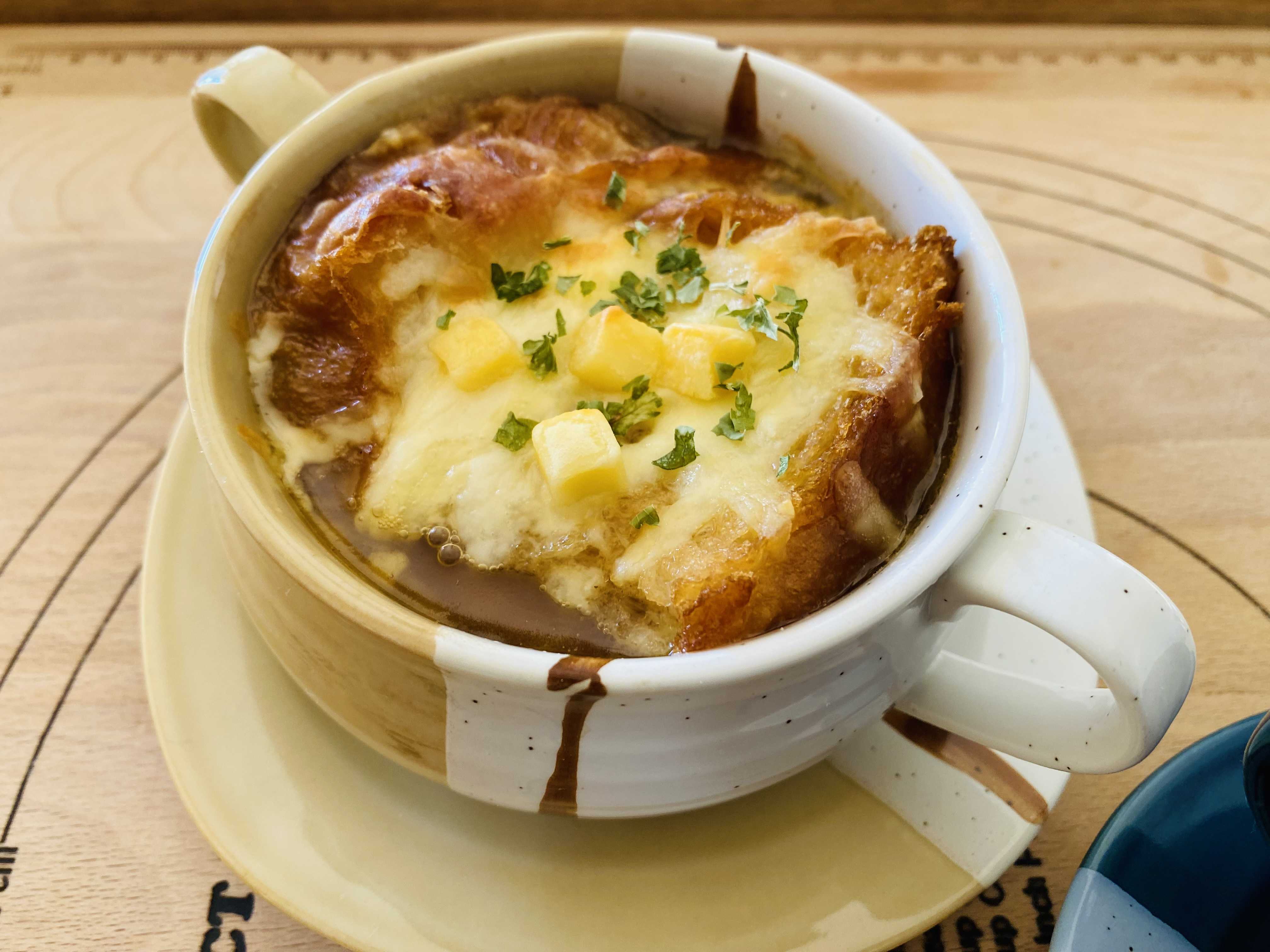 こんにちはここのところの朝晩の冷え込みを思えば日中の暖かさはちょうど過ごしやすくてとても良い感じですそんなお昼を過ぎたところでいつものようにcookingのお届けですね今日はめずらしく午前中に投稿があったのでちょっとcookingの開始が遅れましたが……で、今回のメニューはというと「オニオングラタンスープ」ですそれというのも、先週末に買い揃えた手持ちの食材を見てみると「たまねぎ」が思いのほか残っていて他にも先日購入した「デニッシュパン」がひと切れだけ残っていたものですからあれこれ考えずにパッと思い浮かんだのがちょうどコレだったんですねッ(他にも何かありそうですが…)※バター・ベーコン・チーズは常備品なのでOKそんなこんなで「はじめてのトライ」となったわけですが、何とかイメージ通りに仕上がったかなぁって思ってますまた後ほど食べてみたいと思います(このあとのおひとりランチに登場予定です)温める前 ↓はじめてにしては良い感じでした